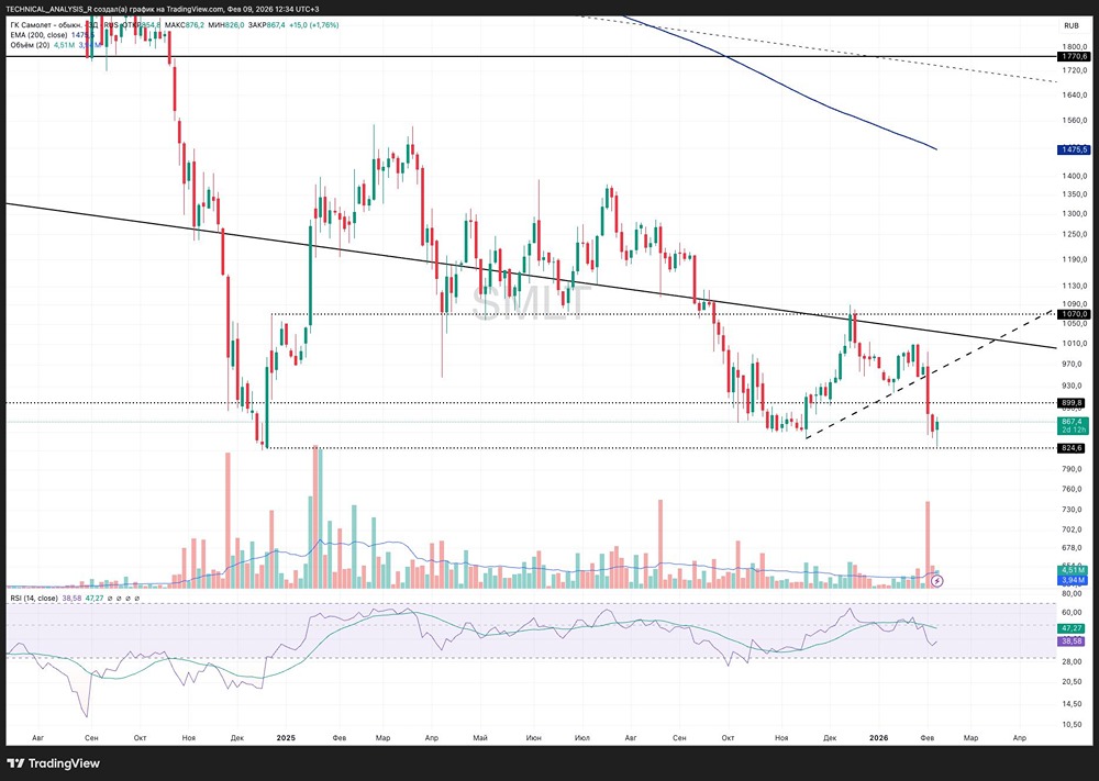 Цена пришла в зону сильной исторической поддержки 820-850 и от неё отскочила. Это логичная реакция, здесь ранее уже появлялся покупатель. Но важно понимать, что перед этим был пробит локальный восходящий тренд, поэтому текущее движение вверх пока выглядит как отскок, а не разворот. Рост возможен. Ближайшая цель отскока 900-920, это около +6% от текущих. Если рынок даст импульс и удастся закрепиться выше 920, тогда следующая зона 980-1000, потенциал уже около +15-18%. Выше можно говорить только при возврате цены над пробитый тренд. Причины возможного роста простые. Сильная историческая поддержка, RSI был в перепроданности, падение прошло слишком быстро без нормальной паузы, рынок пытается восстановиться. Причины такого падения тоже очевидны. Пробой восходящего тренда, отсутствие поддержки выше 900, фиксация после прошлого роста и общая слабость в бумаге. Как только тренд сломали, цену быстро вынесли к следующему сильному уровню. Вывод. Сейчас это отскок от поддержки, а не смена тренда. Пока цена ниже 920-950, движение вверх остаётся коррекцией. Потеря 820 сломает даже этот сценарий и откроет дорогу ниже. Не является индивидуальной инвестиционной рекомендацией [mondiara.com](https://mondiara.com) 👆 Больше новостей и анализа Скачать приложение в [App Store](https://apps.apple.com/ru/app/m-o-n-d-i-a-r-a/id6475953453) Скачать приложение в [Google Play](https://play.google.com/store/apps/details?id=com.mondiara.app) Пост взят с международного сервиса для инвесторов и трейдеров [M O N D I A R A](https://i.mondiara.com/) Источник: Капибара на Бирже