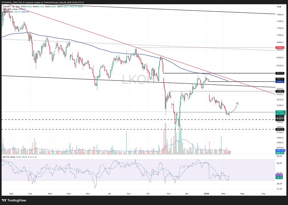 Цена пришла в зону сильной поддержки 5100-5150, откуда уже была реакция. Падение затухает, импульса вниз нет, объёмы снижаются — давление продавца ослабевает. Восстановление возможно. Базовый сценарий — отскок от 5100 с движением к 5350-5500. Это примерно +5-7%. Дальше ключевая зона 5600-5650, где проходит бывшая поддержка и нисходящий тренд — там рынок может снова тормозить. Причины восстановления простые. Сильный уровень, RSI в перепроданности, падение было резким и без нормальной паузы, рынок пытается выдохнуть. Но важно понимать — глобально тренд пока нисходящий. Пока цена ниже 5600-5800, любое движение вверх остаётся коррекцией. Вывод. Отскок от 5100 логичен и может продолжиться. Потеря 5000 сломает сценарий и откроет дорогу к 4800. Не является индивидуальной инвестиционной рекомендацией [mondiara.com](https://mondiara.com) 👆 Больше новостей и анализа Скачать приложение в [App Store](https://apps.apple.com/ru/app/m-o-n-d-i-a-r-a/id6475953453) Скачать приложение в [Google Play](https://play.google.com/store/apps/details?id=com.mondiara.app) Пост взят с международного сервиса для инвесторов и трейдеров [M O N D I A R A](https://i.mondiara.com/) Источник: Капибара на Бирже