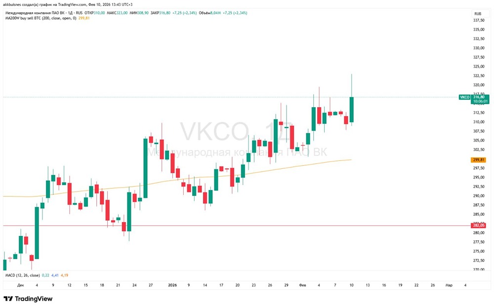 VK резко ускорился до 320 — это прямая реакция на новости о замедлении Telegram. Пробой этого уровня на объемах подтверждает, что рынок всерьез закладывает сценарий перетока аудитории в MAX. Сейчас жду закрепления выше 320, что откроет дорогу на 340, пробой которого окончательно подтвердит переход к мощному аптренду. Новости стали тем самым триггером, который вывел бумагу из консолидации. Любой локальный откат воспринимаю как возможность для добора позиции, а не разворот. Мой план: держать лонги и ждать штурма 350 на горизонте ближайших недель. Технически всё указывает на продолжение ралли, слома структуры не наблюдаю. Не является индивидуальной инвестиционной рекомендацией [mondiara.com](https://mondiara.com) 👆 Больше новостей и анализа Скачать приложение в [App Store](https://apps.apple.com/ru/app/m-o-n-d-i-a-r-a/id6475953453) Скачать приложение в [Google Play](https://play.google.com/store/apps/details?id=com.mondiara.app) Пост взят с международного сервиса для инвесторов и трейдеров [M O N D I A R A](https://i.mondiara.com/) Источник: БИРЖЕВОЙ МАКЛЕР