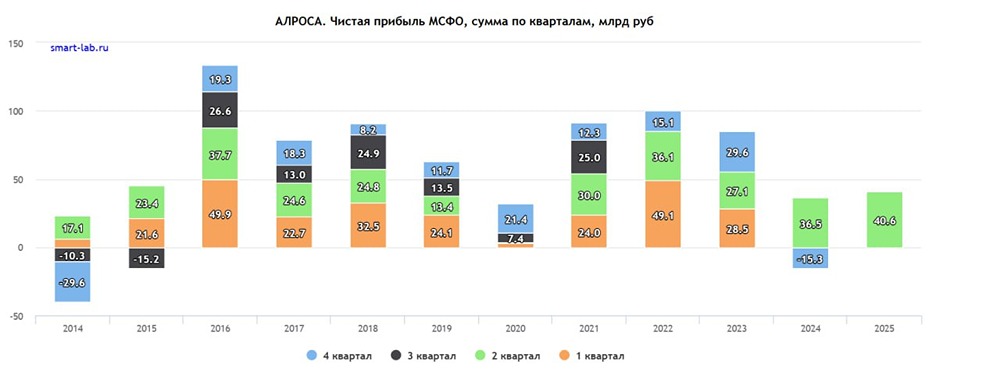 Акции «Алросы» продолжают падать, достигнув уровня около 40 рублей за бумагу. С максимумов они снизились на 74%, упав с 150 рублей. Проблемы компании не исчезают, а цены на алмазы снижаются уже четвёртый год подряд. Последний отчёт за первое полугодие 2025 года может ввести в заблуждение. 1. Выручка упала на 25%: с 179,4 миллиарда до 134,25 миллиарда рублей. 2. Чистая прибыль выросла на 10%: с 36,6 миллиарда до 40,6 миллиарда рублей. 3. Свободный денежный поток (FCF) составил 28 миллиардов рублей, но без учёта единовременного дохода от «Катоки» он стал отрицательным — минус 6 миллиардов рублей. Это значит, что надежды на дивиденды невелики. 4. Чистый долг снизился с 108 миллиардов до 61 миллиарда рублей благодаря продаже «Катоки». Однако соотношение чистого долга к EBITDA составило 1,1x, что выглядит нормально. Но давайте разберёмся в этих цифрах подробнее. В первом полугодии 2025 года «Алроса» получила 16 миллиардов рублей от продажи своей доли в горнорудной компании «Катока» и 19 миллиардов рублей от переуступки прав на её дивиденды. По дивидендной политике компания выплачивает 50–70% от FCF, если соотношение чистого долга к EBITDA находится в диапазоне 1,0x–1,5x. Однако выплаты не должны быть ниже 50% чистой прибыли по МСФО. При FCF в 28 миллиардов рублей дивиденд за первое полугодие 2025 года мог бы составить 1,9–2,6 рубля (4,7–6,5% доходности). Однако я сомневаюсь, что эти выплаты будут сделаны, так как без учёта дохода от «Катоки» дивиденды оказываются под вопросом. Даже если выплатят 2,6 рубля за первое полугодие 2025 года, в будущем платить будет нечем. Без учёта «Катоки» FCF за первое полугодие 2025 года отрицательный. С учётом текущих цен на бриллианты FCF будет отрицательным и во втором полугодии 2025, а также в первом и втором полугодии 2026 года, что исключит возможность дивидендов. У компании на данный момент 115,4 миллиарда рублей кэша при 176 миллиардах кредитов. Без продажи «Катоки» ситуация была бы менее оптимистичной. Возникает интересная ситуация: «Алроса» вышла из одного из своих ключевых активов, что привело к временному росту прибыли, FCF и снижению чистого долга. Это может привести к выплате дивидендов в размере 6% за первое полугодие, но такой шаг ускорит ухудшение финансового состояния компании. Я не верю в дивиденды, но если их рекомендуют, то покупать акции на этой новости нельзя. Это будет единоразовая выплата за счёт денег от «Катоки», а затем FCF станет отрицательным, и ситуация ухудшится. Спасёт ли Минфин положение? В интервью замглавы Минфина Моисеев заявил, что лимит закупок в Гохран составляет 50 миллиардов рублей, но торопиться с этим не будут. 29 января 2026 года выйдет новость о подготовке проекта указа о введении экспортных пошлин на алмазы для поддержки отечественной гранильной отрасли. Введение пошлин на фоне санкций и проблем с экспортом ещё сильнее ударит по «Алросе». Ничего позитивного в этом нет. Итог: P/E = 11,6 и EB/EBITDA = 8 выглядят дорого при будущем отрицательном FCF. Компания не торгуется с дисконтом к историческим оценкам, при этом долговая нагрузка ухудшилась, а дивиденды не предвидятся. Во втором полугодии 2025 и в 2026 году цены на алмазы продолжат снижаться, а эффект от «Катоки» повторить не удастся. Это означает, что нас ждут плохие отчёты за второе полугодие 2025 и первое полугодие 2026. Я продал все свои акции «Алросы» ещё в июне 2025 года по 47,48 рубля за акцию и оказался прав. Н