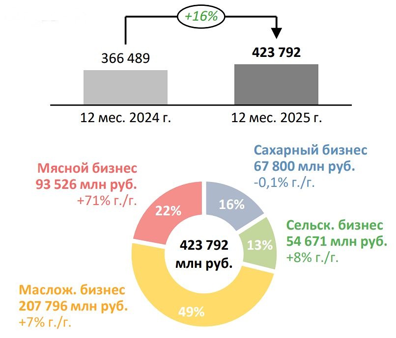 Есть ли перспективы? ▫️ Рыночная капитализация: 116 млрд руб. ▫️ Цена акции: 120,6 руб. ▫️ Выручка 2025: 424 млрд руб. (+16% год к году) ▫️ Чистая прибыль за последний квартал: 30,4 млрд руб. ▫️ Скорректированная чистая прибыль за последний квартал: 24 млрд руб. ▫️ P/E за последний квартал: 4,8 ▫️ Прогнозируемый P/E на 2026 год: 2,9 ⚠️ В компании «Русагро» произошли изменения: Мошковичу (основному акционеру) и Басову (бывшему генеральному директору) предъявили обвинения в легализации доходов. Общая сумма претензий достигла 86 млрд руб. 👆 Эта новость вызвала беспокойство у инвесторов, хотя для миноритариев ситуация не изменилась. Существует риск смены собственника, который может отказаться от выплаты дивидендов или даже лишить компанию публичного статуса, предложив невыгодные условия выкупа акций. Однако отсутствие дивидендов уже учтено в текущей цене акций. После ареста Мошковича они упали на 50%, что можно считать справедливым дисконтом. ✅ Компания опубликовала операционные результаты за 2025 год. Выручка выросла на 16%, что свидетельствует о развитии бизнеса. 🥩 Основной драйвер роста — мясной сегмент, который принёс 93,5 млрд руб. (+71% год к году) после объединения с Агро-Белогорьем. Производство в живом весе увеличилось до 571 тысячи тонн (+64% год к году). 🌻 Производство растительных масел снизилось на 16% из-за плановой модернизации Аткарского МЭЗ, которая начнётся с 1 апреля 2025 года. 🍰 Производство сахара сократилось на 15% из-за низкой дигестии сахарной свёклы в сезоне 2025/26. 🌾 Реализация зерновых культур выросла на 47% благодаря высокой урожайности и увеличению экспортных продаж. ✅ На результаты компании могут положительно повлиять рост цен на подсолнечное масло из-за перебоев в поставках из Украины и высокие цены на пшеницу в США, которые сейчас сопоставимы с уровнем 2007 года. Однако даже при благоприятном сценарии «Русагро» может не получить значительной прибыли. ❌ В октябре я [уже отмечал](https://t.me/taurenin/3385), что рентабельность компании мизерная: скорректированная чистая прибыль за первое полугодие 2025 года составила всего 3,9 млрд руб. 2025 год может оказаться слабым или даже убыточным из-за крепкого рубля. Существенное давление на прибыль оказывают процентные расходы при чистом долге около 150 млрд руб. Хотя долговая нагрузка компании остаётся комфортной. 👆 Если в 2026 году реализуется позитивный сценарий, компания покажет прибыль около 40 млрд руб. (fwd P/E = 2,9). Это не самая низкая оценка на фоне существующих рисков, отсутствия дивидендов, ставки безриска 14% и невысоких шансов на такой удачный год. Вывод: Компания пока не вернулась к выплате дивидендов, и решение проблемы с основным акционером может занять несколько месяцев. Если учесть все благоприятные факторы на 2026 год, «Русагро» торгуется не намного дешевле «Транснефти» и значительно дороже «ИнтерРАО» — компаний с более стабильной дивидендной историей и низким мультипликатором. Сейчас есть небольшой дисконт к справедливой цене, но его недостаточно для участия в этой истории. Есть и более привлекательные альтернативы. Не является индивидуальной инвестиционной рекомендацией [mondiara.com](https://mondiara.com) 👆 Больше новостей и анализа Скачать приложение в [App Store](https://apps.apple.com/ru/app/m-o-n-d-i-a-r-a/id6475953453) Скачать приложение в [Google Play](https://play.google.com/store/apps/details?id=com.mondiara.app) Пост взят с международного сервиса для инвесторо