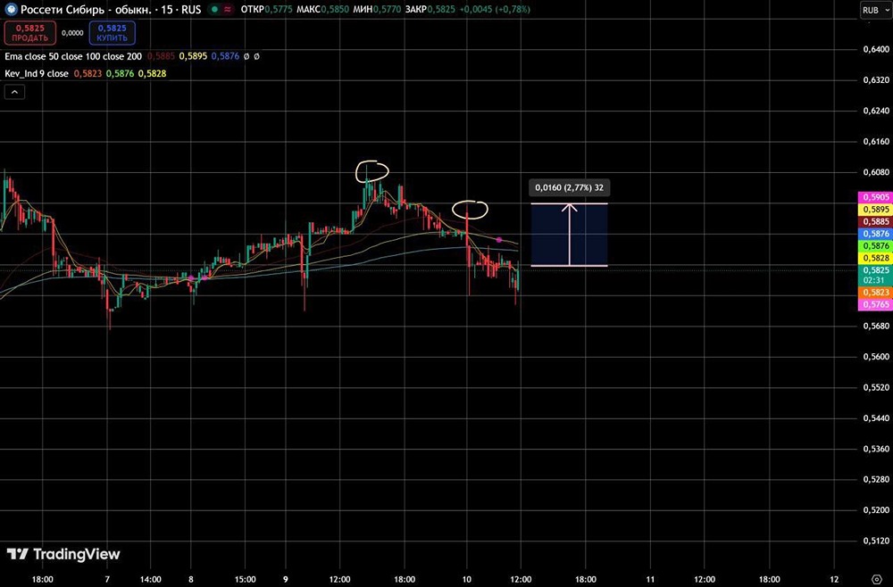 Россети Сибирь Теперь смотрим, что у нас с этой компанией. Произошло заметное снижение с вышестоящих уровней, где образовались шипы, которые в последствии нужно закрыть. В частности, этот шип на 0.6 пунктов виден на 15-минутном таймфрейме. Точка входа — 0.5835, акции перепроданы из-за RSI, равному 16.61 и CCI, равному -350.46. Идем в лонг на закрытие вышестоящих целей: 🎯 1 цель: 0.59 (+ 1.114%) 🎯 2 цель: 0.6 (+ 2.828%) Не является индивидуальной инвестиционной рекомендацией [mondiara.com](https://mondiara.com) 👆 Больше новостей и анализа Скачать приложение в [App Store](https://apps.apple.com/ru/app/m-o-n-d-i-a-r-a/id6475953453) Скачать приложение в [Google Play](https://play.google.com/store/apps/details?id=com.mondiara.app) Пост взят с международного сервиса для инвесторов и трейдеров [M O N D I A R A](https://i.mondiara.com/) Источник: Биржевой магнат