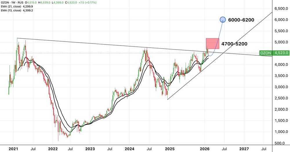 Акции «Озона» на недельном таймфрейме смотрятся очень уверенно. Среднесрочно ожидаю продолжение роста, главное — миновать зону сопротивления ₽4700–5200. 📌 Моя среднесрочная цель — ₽6000–6200 (+37,2%). Не является индивидуальной инвестиционной рекомендацией [mondiara.com](https://mondiara.com) 👆 Больше новостей и анализа Скачать приложение в [App Store](https://apps.apple.com/ru/app/m-o-n-d-i-a-r-a/id6475953453) Скачать приложение в [Google Play](https://play.google.com/store/apps/details?id=com.mondiara.app) Пост взят с международного сервиса для инвесторов и трейдеров [M O N D I A R A](https://i.mondiara.com/) Источник: Invest Premium