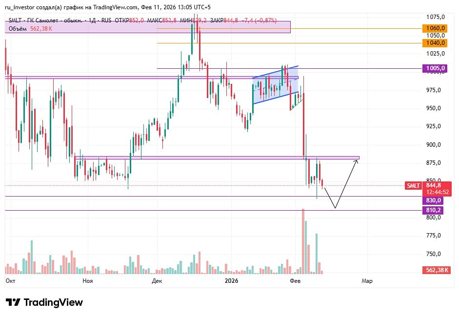 Отскок — это всё, на что хватило «Самолёт» на объяснениях от менеджмента. Дальше бумагу снова утопили. Думаю, можно ждать на основных поддержках, а оттуда — отскок. 💼 Уровень потенциального отскока 810. 🏹 Цель 880. ❌ Стоп поставим под минимум после разворота. Пока звонок 800. Не является индивидуальной инвестиционной рекомендацией [mondiara.com](https://mondiara.com) 👆 Больше новостей и анализа Скачать приложение в [App Store](https://apps.apple.com/ru/app/m-o-n-d-i-a-r-a/id6475953453) Скачать приложение в [Google Play](https://play.google.com/store/apps/details?id=com.mondiara.app) Пост взят с международного сервиса для инвесторов и трейдеров [M O N D I A R A](https://i.mondiara.com/) Источник: Хроники Инвестора