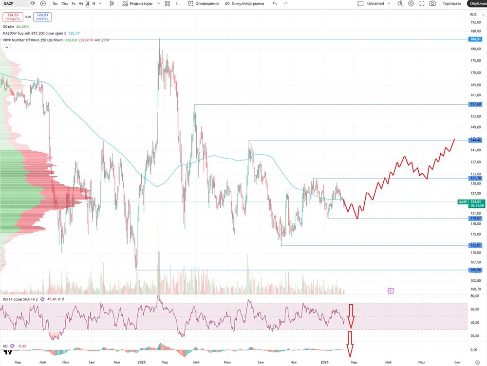 Аналитика по компании Сектор: энергетика. Последний анализ по Газпрому я проводил 25 ноября 2025 года. Тогда акции стоили 127 рублей, и я ожидал боковик в диапазоне 120–133 рублей. На самом деле, мы до сих пор находимся в этом диапазоне — 120–132 рубля. Как я и предсказывал. Сейчас акции торгуются по 124,5 рубля. Посмотрим, что будет дальше. Основные метрики - Капитализация: 37,68 млрд долларов. - P/E: 2,16. - P/S: 0,28. - P/B: 0,16. - EPS: 56,85. - EBITDA: 3,02 трлн рублей. - EV/EBITDA: 1,71. По сравнению с прошлым обзором, прибыль выросла, а оценка по метрикам стала ниже. Давайте разберём последний отчёт. Новостной фон - Газпром успешно закрыл книгу заявок по выпуску облигаций в долларах с расчётами в рублях на сумму 250 млн долларов. Ставка купона — 7,5% годовых, срок — 5 лет. - С 1 октября 2026 года оптовые цены на газ в России для всех потребителей будут проиндексированы на 9,6% по приказу ФАС. - Третий день подряд Газпром обновляет исторический рекорд суточных поставок газа в феврале российским потребителям — 1817,8 млн кубометров. - Газпром и НОВАТЭК могут заключить соглашение о свопе СПГ для газификации Камчатского края. Финансовое здоровье - Собственный капитал за 9 месяцев 2025 года вырос на 6%. - Чистый долг снизился на 58%. - Net Debt / EBITDA — 0,74. Низкая долговая нагрузка, самая низкая за последние 10 лет. СК растёт, долг снижается, и он уже небольшой. У компании хорошее финансовое здоровье. Выручка и прибыль - Выручка за 9 месяцев 2025 года упала на 3%. - Прибыль выросла на 9%. - Свободный денежный поток за 9 месяцев 2025 года вырос на 240%. Будущее и оценки Свежих прогнозов нет. Вот последние: - 1 сентября от ПСБ: 180 рублей. - 4 сентября от АКБФ Инвестиции: 230,38 рубля. - 13 ноября от БКС: 130 рублей. Основные акционеры - РФ: 38,4%. - Роснефтегаз: 11%. - Росгазификация: 0,9%. Сравнение с конкурентами Газпром входит в пятёрку по капитализации в своём секторе. По метрикам он оценивается дешевле сектора, но долговая нагрузка выше. По рентабельности компания слабее сектора. За последние 5 лет рост выручки в среднем по сектору и чуть лучше. Дивиденды Газпром не платит дивиденды с 2022 года. Технический анализ Сначала ожидается коррекция (возможно, в районе 120 рублей), после чего я ожидаю рост до 145 рублей. Это я отобразил на графике. Выводы Ситуация улучшается: долги снижаются, финансовое здоровье становится лучше, прибыль растёт, хотя выручка немного упала. С такими темпами Газпром может вернуться к выплате дивидендов при благоприятных рыночных условиях (геополитика, ставка и т. д.). Рынок пока не замечает, что у компании всё хорошо, особенно без полноценного европейского рынка. Геополитика пугает инвесторов и мешает им зайти. У меня есть акции Газпрома (средняя цена — 136 рублей), пусть мечты сбываются. Не является индивидуальной инвестиционной рекомендацией [mondiara.com](https://mondiara.com) 👆 Больше новостей и анализа Скачать приложение в [App Store](https://apps.apple.com/ru/app/m-o-n-d-i-a-r-a/id6475953453) Скачать приложение в [Google Play](https://play.google.com/store/apps/details?id=com.mondiara.app) Пост взят с международного сервиса для инвесторов и трейдеров [M O N D I A R A](https://i.mondiara.com/) Источник: Павел Шумилов