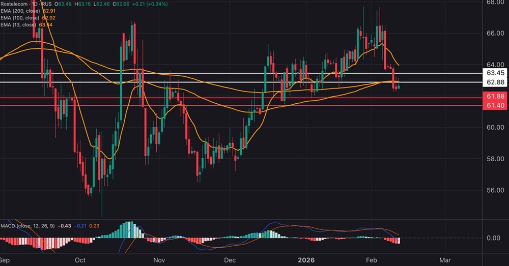 «Ростелеком» пробил важную поддержку на ₽63, и пока котировки находятся ниже этого уровня — вероятна просадка до следующих поддержек на ₽61,4–61,8. MACD дает сигнал на лонг, но я считаю его ложным, поскольку MACD дает такой сигнал после долгого падения. Можно считать такой сигнал передышкой перед вероятным продолжением падения. Среднесрочно будет интерес зайти в лонг, но в данный момент — шорт или на забор. Не является индивидуальной инвестиционной рекомендацией [mondiara.com](https://mondiara.com) 👆 Больше новостей и анализа Скачать приложение в [App Store](https://apps.apple.com/ru/app/m-o-n-d-i-a-r-a/id6475953453) Скачать приложение в [Google Play](https://play.google.com/store/apps/details?id=com.mondiara.app) Пост взят с международного сервиса для инвесторов и трейдеров [M O N D I A R A](https://i.mondiara.com/) Источник: Дневник Инсайдера