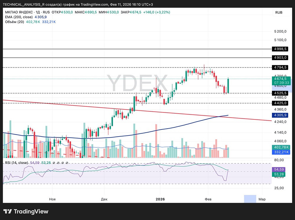 Цена сделала мощный импульс +3% вверх и упёрлась в 4790–4800 — это сильное сопротивление. Оттуда началась фиксация и коррекция к зоне 4525. Сейчас идёт отскок от 4525. Это нормальная реакция после пролива. Плюс цена выше EMA200 — среднесрочно структура всё ещё бычья. Если закрепимся выше 4700, снова можем пойти на 4790–4900. Потенциал от текущих около 4–6%. Если же 4525 пробьют и закрепятся ниже, тогда дорога на 4425 и к EMA200 в районе 4300. Это минус 5–8%. Пока это больше похоже на здоровую коррекцию в растущей структуре. Вероятность продолжения роста примерно 65%, если удержат 4525. Не является индивидуальной инвестиционной рекомендацией [mondiara.com](https://mondiara.com) 👆 Больше новостей и анализа Скачать приложение в [App Store](https://apps.apple.com/ru/app/m-o-n-d-i-a-r-a/id6475953453) Скачать приложение в [Google Play](https://play.google.com/store/apps/details?id=com.mondiara.app) Пост взят с международного сервиса для инвесторов и трейдеров [M O N D I A R A](https://i.mondiara.com/) Источник: Капибара на Бирже