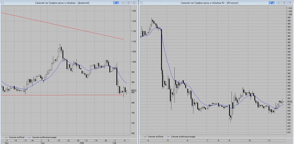 Акции «Самолёт» вновь откупают от линии дневного уровня поддержки, проходящей около цены 840 руб. Закрепление над линией часового индикатора МА-13 с попыткой формирования концентрации способствует росту в четверг к ценам 875 – 880 руб. Внутри концентрации есть сигнал в лонг. Со стоп-лоссом на цене 853,5 руб. Целью для фиксации прибыли выступит цена 875 руб. Среднесрочно тут есть риск формирования медвежьей конструкции для пробоя уровня поддержки и начала нового витка снижения, однако лично я рассматриваю базовым сценарием повторение осенней картинки прошлого года, где после попытки поджатия к уровню котировки показали обратный итог с переходом к росту. Не является индивидуальной инвестиционной рекомендацией [mondiara.com](https://mondiara.com) 👆 Больше новостей и анализа Скачать приложение в [App Store](https://apps.apple.com/ru/app/m-o-n-d-i-a-r-a/id6475953453) Скачать приложение в [Google Play](https://play.google.com/store/apps/details?id=com.mondiara.app) Пост взят с международного сервиса для инвесторов и трейдеров [M O N D I A R A](https://i.mondiara.com/) Источник: Тех.Анализ