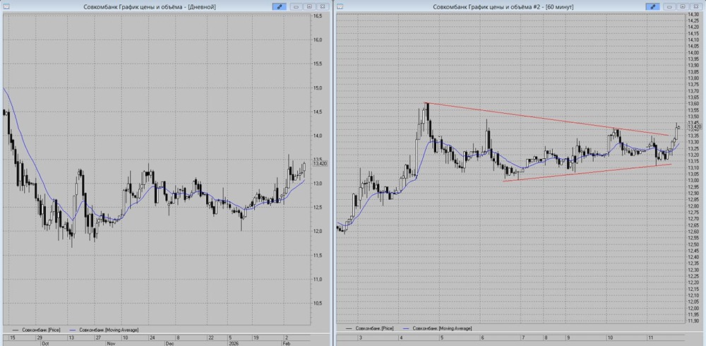 «Совкомбанк» продолжает торговаться в рамках боковой коррекции с удержанием котировок над линией дневной скользящей МА-13. Что по итогу даёт возможность для нового витка роста к ценам 14 – 14,5 руб. в рамках реализации формирующихся бычьих моделей внутри боковика. Одна из таких уже пытается начать реализацию, однако с учётом общего фона пока не жду продолжения роста, и в четверг котировки, скорее всего, попытаются вновь снизиться к линии дневного индикатора. Спекулятивно подобные снижения можно использовать для набора среднесрочных лонгов. Со стоп-лоссом на цене 13 руб. С целью начала фиксации прибыли с цены 14 руб. и выше. Не является индивидуальной инвестиционной рекомендацией [mondiara.com](https://mondiara.com) 👆 Больше новостей и анализа Скачать приложение в [App Store](https://apps.apple.com/ru/app/m-o-n-d-i-a-r-a/id6475953453) Скачать приложение в [Google Play](https://play.google.com/store/apps/details?id=com.mondiara.app) Пост взят с международного сервиса для инвесторов и трейдеров [M O N D I A R A](https://i.mondiara.com/) Источник: Тех.Анализ