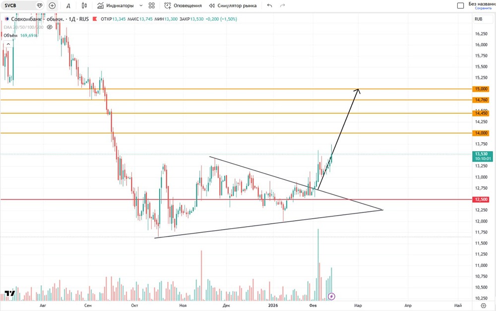 До каких целей на графике держать акции Совкомбанка в феврале-марте 2026 года?
