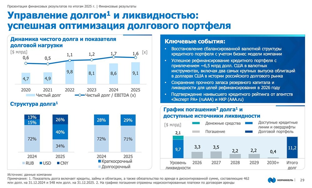 Во второй половине 2025 года рынок цветных металлов оживился. Никель, медь и платиновые металлы выросли в цене, что положительно сказалось на акциях Норникеля. Важно рассмотреть финансовые результаты компании за этот период и оценить перспективы роста. Особенно учитывая недавнее снижение цен на металлы. Выручка Норникеля за 2025 год выросла на 10%, достигнув $13,8 млрд. Во второй половине года цены на металлы значительно улучшились, что привело к росту свободного денежного потока (FCF) компании на 88% до $3,5 млрд. Это позволяет акционерам надеяться на дивиденды после двухлетнего перерыва. Скорректированный FCF после выплаты процентов по кредитам и дивидендов миноритарным акционерам Быстринского ГОКа составил $1,5 млрд. Чистый долг компании снижается, а его отношение к EBITDA опустилось до комфортного уровня 1,6. Если цены на металлы останутся высокими, а курс доллара стабилизируется на уровне 90+, Норникель может установить новый рекорд по выручке и FCF. Менеджмент компании пока не планирует выплачивать дивиденды до 2027 года. В декабре Владимир Потанин заявил, что результаты 2026 года станут основой для возможного возврата к выплатам. Рынок уже ожидает «дивидендную паузу», независимо от реальных финансовых показателей. Несмотря на улучшение финансовых показателей, рынок оценивает Норникель консервативно: P/E около 4, EV/EBITDA — 3–4. Исторически компания торговалась в диапазоне 6–8 P/E. Основной причиной такого дисконта является отсутствие формализованной дивидендной политики после 2022 года и вывод прибыли через дивиденды Быстринского ГОКа, так называемый «дисконт Потанина». Возникают противоречия в аргументации менеджмента. Ранее компания заявляла, что при положительном денежном потоке будет выплачивать дивиденды. Однако даже в менее благоприятные периоды FCF оставался положительным. Тем не менее, решение о распределении прибыли откладывается. Публичных заявлений о масштабных инвестиционных проектах, которые могли бы обосновать полное реинвестирование прибыли, также не было. Норникель находится в благоприятной фазе сырьевой конъюнктуры: восстанавливается маржа, растет денежный поток, а оценка компании остается низкой. Для полноценного роста рынку нужен не только рост цен на металлы, но и четкий сигнал по дивидендам. Почти полмиллиона частных инвесторов ждут дивидендов. Пора бы менеджменту Норникеля учесть их интересы. Не является индивидуальной инвестиционной рекомендацией [mondiara.com](https://mondiara.com) 👆 Больше новостей и анализа Скачать приложение в [App Store](https://apps.apple.com/ru/app/m-o-n-d-i-a-r-a/id6475953453) Скачать приложение в [Google Play](https://play.google.com/store/apps/details?id=com.mondiara.app) Пост взят с международного сервиса для инвесторов и трейдеров [M O N D I A R A](https://i.mondiara.com/) Источник: ИнвестТема | Литвинов Владимир