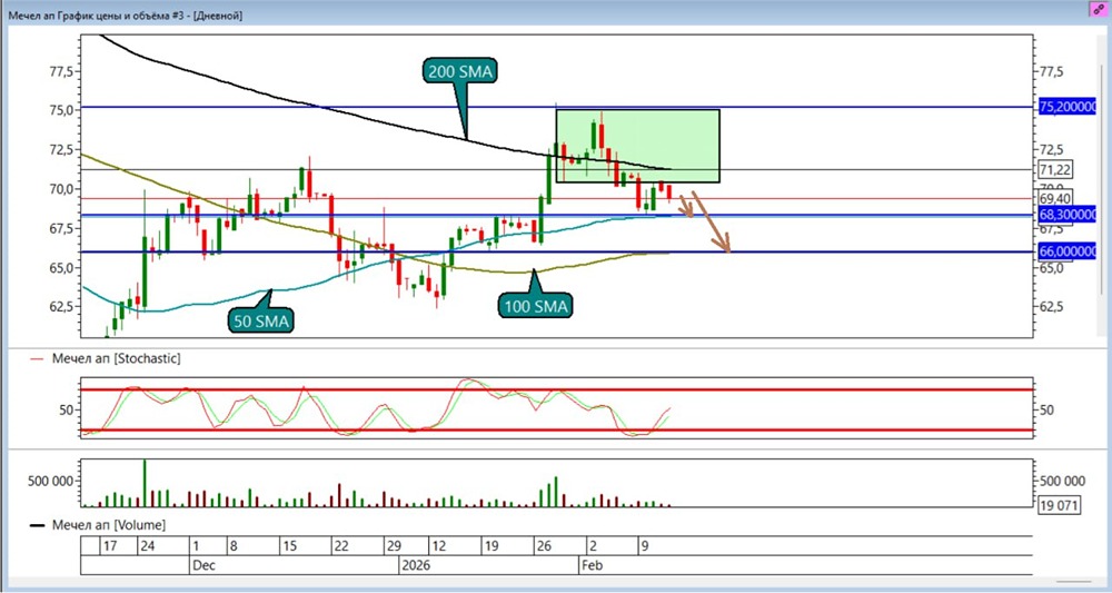 После пробоя локального минимума в акциях Мечел-преф был тест боковика снизу. Могу предположить, что движение продолжится вниз. Сверху объемы на продажу и 200 SMA как сопротивление. ❗️Цели по шорту на уровне ₽68,3. Далее ₽66. ❌ Стоп ₽75,2. Не является индивидуальной инвестиционной рекомендацией [mondiara.com](https://mondiara.com) 👆 Больше новостей и анализа Скачать приложение в [App Store](https://apps.apple.com/ru/app/m-o-n-d-i-a-r-a/id6475953453) Скачать приложение в [Google Play](https://play.google.com/store/apps/details?id=com.mondiara.app) Пост взят с международного сервиса для инвесторов и трейдеров [M O N D I A R A](https://i.mondiara.com/) Источник: Stocks Rocks (Акции Рулят)