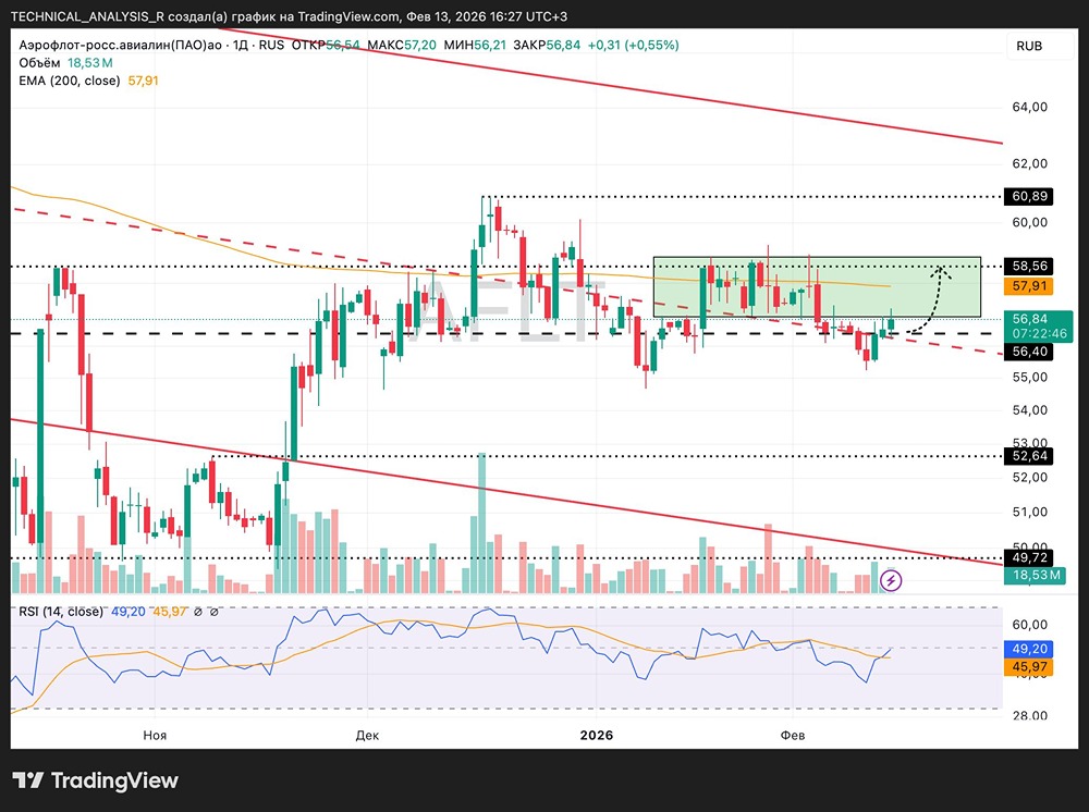 Цена дала отскок от середины нисходящего канала и локальной поддержки 56.40. Покупатель аккуратно включается, но пока это именно отскок внутри структуры, а не разворот. 📈 Поддержка 56.40 удержана, ниже ключевой уровень 52.64. Его потеря вернёт давление продавца. Сопротивление 58.56 и зона 60.89. Именно туда сейчас смотрит цена. EMA200 проходит в районе 57.91 и выступает промежуточным барьером. RSI около 48-49, выходит из локальной слабости, перегрева нет. Объёмы умеренные, панических продаж нет. ⚡️ Бумага чувствительна к новостям по турпотоку, курсу валют и господдержке отрасли. Любой позитив по пассажиропотоку или субсидиям усиливает интерес к бумаге. Пока глобальный тренд остаётся нисходящим, поэтому среднесрочно это всё ещё торговля в канале. ✅ Отскок от середины канала состоялся. Пока цена держится выше 56.40, сценарий движения к 58.50-60 остаётся рабочим. Но глобально структура ещё не сломана вверх. Для уверенного лонга нужен выход выше 58.50 с закреплением. Не является индивидуальной инвестиционной рекомендацией [mondiara.com](https://mondiara.com) 👆 Больше новостей и анализа Скачать приложение в [App Store](https://apps.apple.com/ru/app/m-o-n-d-i-a-r-a/id6475953453) Скачать приложение в [Google Play](https://play.google.com/store/apps/details?id=com.mondiara.app) Пост взят с международного сервиса для инвесторов и трейдеров [M O N D I A R A](https://i.mondiara.com/)