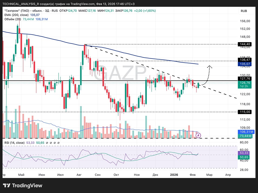 Газпром снова тестирует нисходящий тренд. Сейчас идёт попытка пробоя сверху вниз сформированной структуры. Цена держится выше 127-128 и поджимается к диагонали. Если будет закрепление выше трендовой и уровня 128, вероятность движения к 135-136 около 65%. Там уже EMA200 на 3Д — серьёзное сопротивление. Если же пробой окажется ложным и уйдём ниже 126, можем снова скатиться к 122-123. Вероятность отката в таком случае около 55%. Сейчас ключ — закрепление. Без него это просто очередной тест. Если объёмы подключатся и закроем свечу выше диагонали — можно аккуратно рассматривать лонг. Не является индивидуальной инвестиционной рекомендацией [mondiara.com](https://mondiara.com) 👆 Больше новостей и анализа Скачать приложение в [App Store](https://apps.apple.com/ru/app/m-o-n-d-i-a-r-a/id6475953453) Скачать приложение в [Google Play](https://play.google.com/store/apps/details?id=com.mondiara.app) Пост взят с международного сервиса для инвесторов и трейдеров [M O N D I A R A](https://i.mondiara.com/) Источник: Капибара на Бирже