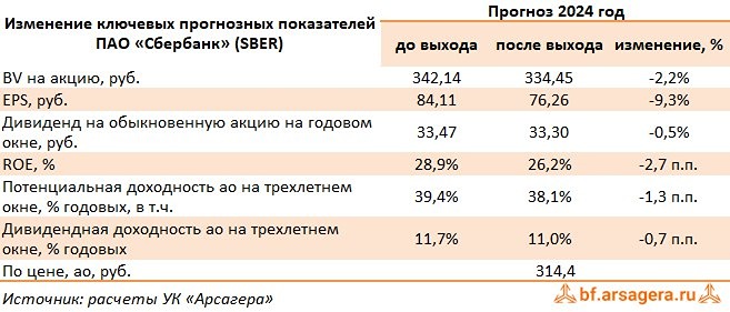 Мнение: УК Арсагера. Сбербанк России. Итоги 1 кв. 2024 г.: снижение доходов на финансовом рынке тормозит увеличение прибыли. Сбербанк раскрыл консолидированную финансовую отчетность по МСФО за 1 кв. 2024 г. Процентные доходы банка увеличились на 64,5% до 1,6 трлн руб. на фоне роста объема кредитного портфеля и удорожания стоимости выданных ссуд. Процентные расходы увеличились более чем вдвое до 849 млрд руб. на фоне роста объема и стоимости привлечения клиентских средств. В итоге чистые процентные доходы в отчетном периоде выросли на четверть, составив 700 млрд руб. Показатель чистой процентной маржи вырос на 0,1 п.п. до 5,9%. Чистые комиссионные доходы выросли на 7,6% до 184,1 млрд руб. Ключевыми драйверами роста стали доходы от операций с банковскими картами, расчетно-кассового и документарного обслуживания. Отметим существенное снижение прибыли от операций с финансовыми инструментами, иностранной валютой в размере 4,2 млрд руб. (-89,4%). В отчетном периоде Сбербанк на четверть сократил объемы начисленных резервов, которые составили 47,7 млрд руб. на фоне снижения стоимости риска с 1,1% до 0,6%. Операционные расходы банка увеличились на 25,1% до 227,6 млрд руб. на фоне роста расходов на персонал (+23,7%). При этом отношение операционных расходов к операционным доходам составило 28,4% против 24,8% годом ранее. В итоге чистая прибыль Сбербанка увеличилась на 11,3%, составив 397,4 млрд руб. По линии балансовых показателей отметим продолжающийся рост кредитного портфеля (+15,6%) до 36,2 трлн руб., главным образом, за счета увеличения количества розничных кредитов. Драйвером роста оставались ипотечное кредитование, автокредитование и кредитные карты. Доля неработающих кредитов незначительно возросла до уровня 3,5%. Отношение созданных резервов под обесценение кредитного портфеля к объему неработающих кредитов составило 128,5%, сократившись на 16,2 п.п. на тфоне перевода части задолженности в категорию кредитов, оцениваемых по справедливой стоимости. Коэффициент достаточности базового капитала 1-го уровня и общего капитала сократился на 130 и 200 базисных пунктов соответственно. Дополнительно отметим, что менеджментом банка были обозначены ориентиры по ключевым показателям на 2024 год. В частности, чистая процентная маржа ожидается на уровне выше 5,7%, рост чистых комиссионных доходов в районе 10%, отношение операционных расходов к доходам на уровне 30-32%, рентабельность собственного капитала - выше 22%. С учетом этих вводных мы ожидаем, что чистая прибыль текущего года составит 1,7-1,8 трлн руб. Отметим также, что Наблюдательным советом банка была дана рекомендация выплатить дивиденды по итогам 2023 г. в размере 33,3 руб. на оба типа акций. По итогам ознакомления с вышедшей отчетностью мы не стали вносить серьезных изменений в модель Сбербанка, ограничившись небольшим снижением прибыли на текущий год по причине опережающего роста процентных расходов, более низких доходов на финансовом рынке, а также превышающих наши ожидания увеличения операционных расходов. В результате потенциальная доходность акций Сбербанка несколько сократилась. В настоящее время обыкновенные акции Сбербанка торгуются с P/BV 2024 около 0,9 и P/E 2024 около 4,1 и продолжают оставаться одной из наших базовых бумаг в секторе ликвидных акций. [Не является индивидуальной инвестиционной рекомендацией]