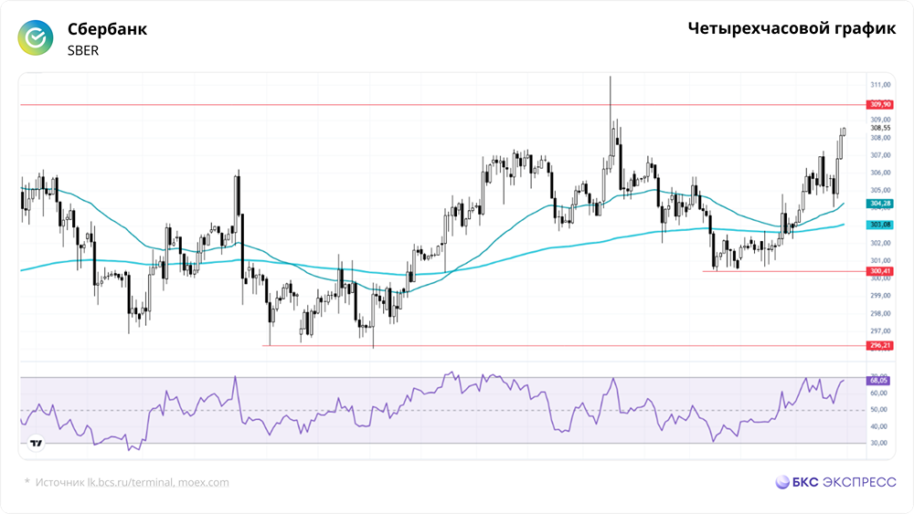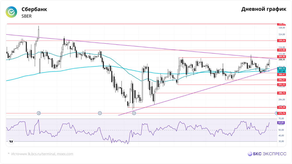 Мнение: БКС Экспресс Прогноз по акциям Сбербанка Акции Сбербанка в пятницу выросли на 1,1% и завершили день на отметке 308,55 руб., при этом объем торгов достиг 11,3 млрд руб. С утра в понедельник бумаги показали небольшой рост на 0,4%. Краткосрочная перспектива • В пятницу акции Сбербанка подорожали на фоне высокой торговой активности. Российский рынок вырос в целом, индекс МосБиржи прибавил 0,39% за основную сессию и завершил день в плюсе на 1,05%. • Утром акции Сбербанка немного снизились, но затем начали расти после открытия основных торгов. Реакция на заседание ЦБ была положительной — рост примерно на 1%. • День завершился белой свечой с умеренной амплитудой, что является позитивным сигналом. Решение ЦБ создало оптимистичный настрой на рынке на ближайшую неделю. • С технической точки зрения, акции Сбербанка могут вырасти выше 310 руб. на этой неделе. Однако мы рекомендуем придерживаться позиционной стратегии: спекулятивные покупки у уровней 300–302 руб. можно частично зафиксировать при росте до 310 руб. • С середины ноября акции консолидируются в боковике 293,3–310 руб. при низких объемах торгов. Движение может стать более направленным после пробоя «Сходящегося треугольника», образованного долгосрочными наклонными линиями. По графику, эта фигура должна сыграть свою роль к марту. Внешний фон • Индекс S&P 500 вырос на 0,05% в пятницу. Фьючерс на индекс утром в плюсе на 0,2%. Индексы Азиатско-Тихоокеанского региона торгуются разнонаправленно. Фьючерс на нефть Brent на Мосбирже снизился на 0,09%, а на мировых рынках нефть утром в плюсе на 0,2%, торгуется на уровне $67,4. Уровни сопротивления: 309,9 / 314,5 / 320,2 Уровни поддержки: 300,4 / 296,2 / 293,3 Долгосрочная перспектива • Акции Сбербанка торгуются на 21% ниже своего исторического максимума. В феврале 2022 года был пробит многолетний тренд, начавшийся в 2014 году. • Поддержка найдена на уровне пологого растущего тренда, идущего от минимумов 2009 года. До середины 2024 года акции уверенно росли, после чего началась коррекция. • Снижение удалось остановить в декабре 2024 года благодаря решению ЦБ не повышать ключевую ставку. Среднесрочный тренд изменился на восходящий. • Ближайшая цель — закрепление выше долгосрочной нисходящей трендовой линии от октября 2021 года. • Неделю завершили белой свечой, что является максимальным закрытием с начала сентября. Есть хорошие предпосылки для возобновления роста. • Аналитики БКС считают акции Сбербанка «позитивными» и прогнозируют цель на год — 410 руб. Автор: Решетников Олег Не является индивидуальной инвестиционной рекомендацией [mondiara.com](https://mondiara.com) 👆 Больше новостей и анализа Скачать приложение в [App Store](https://apps.apple.com/ru/app/m-o-n-d-i-a-r-a/id6475953453) Скачать приложение в [Google Play](https://play.google.com/store/apps/details?id=com.mondiara.app) Пост взят с международного сервиса для инвесторов и трейдеров [M O N D I A R A](https://i.mondiara.com/) Источник: bcs-express.ru