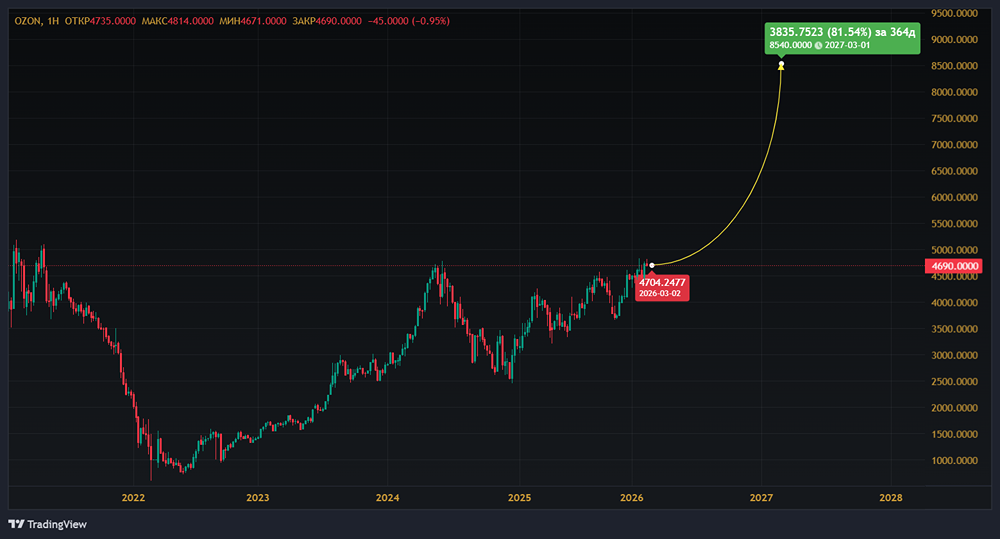 Мнение: Велес Капитал Взгляд на акции Озона Ozon объявит финансовые результаты за четвертый квартал 2025 года в следующий четверг, 26 февраля. По нашим оценкам, оборот компании вырос на 30% год к году, что заметно медленнее, чем более 50% в предыдущие кварталы. Основная причина замедления — эффект высокой базы. Снижение среднего чека могло ослабить положительный эффект от роста числа заказов. Мы прогнозируем, что годовой оборот увеличится на 44% год к году, что выше целевого показателя компании в 41–43%. Скорректированная EBITDA Ozon в четвертом квартале могла составить около 36 млрд рублей, а рентабельность — 2,9% от GMV. Мы ожидаем, что EBITDA компании в 2025 году выросла почти в четыре раза и достигла 149 млрд рублей, что выше прогноза группы на уровне около 140 млрд рублей. Компания могла завершить прошлый год с минимальным чистым убытком и, по нашему мнению, покажет значительную чистую прибыль в 2026 году. Мы считаем, что целевой уровень рентабельности группы смещается с прежних 3–4% до 5–6% GMV, что мы учли в нашей модели. Ozon остается одним из наших фаворитов на российском рынке. Мы рекомендуем «Покупать» акции компании. Целевая цена повышена до 8 540 рублей за бумагу. Автор: Артём Михайлин Не является индивидуальной инвестиционной рекомендацией [mondiara.com](https://mondiara.com) 👆 Больше новостей и анализа Скачать приложение в [App Store](https://apps.apple.com/ru/app/m-o-n-d-i-a-r-a/id6475953453) Скачать приложение в [Google Play](https://play.google.com/store/apps/details?id=com.mondiara.app) Пост взят с международного сервиса для инвесторов и трейдеров [M O N D I A R A](https://i.mondiara.com/) Источник: t.me/velescapital