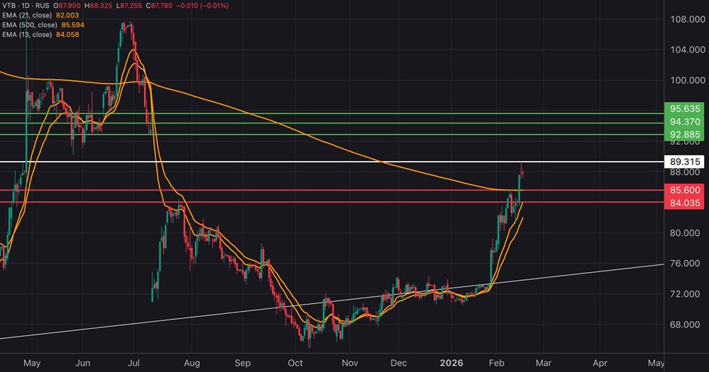 Акции ВТБ в устойчивом восходящем тренде, цель ₽85 отработана, в моменте цены даже доходили до ₽89,37. Краткосрочно котировки могут скорректироваться до ближайших поддержек. Нас интересует диапазон уровней ₽84-85,6. Оттуда можно думать о лонге с среднесрочными целями ₽93-94-95. То есть как минимум можно рассчитывать на закрытие дивгэпа. Не является индивидуальной инвестиционной рекомендацией [mondiara.com](https://mondiara.com) 👆 Больше новостей и анализа [Скачать](https://apps.apple.com/ru/app/m-o-n-d-i-a-r-a/id6475953453) приложение в App Store [Скачать](https://play.google.com/store/apps/details?id=com.mondiara.app) приложение в Google Play Пост взят с международного сервиса для инвесторов и трейдеров [M O N D I A R A](https://i.mondiara.com/) Источник: Дневник Инсайдера