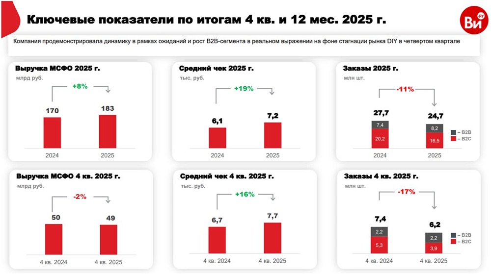 ВсеИнструменты: дивиденды ради видимости благополучия? Согласно данным «Ъ», крупнейшие DIY-сети в 2025 году увеличили оборот лишь на 4,5–8%. Это связано с общим охлаждением экономики и спадом в строительном секторе. Сегодня мы рассмотрим операционный отчет ВИРУ (ВсеИнструменты.ру) и выясним, являются ли дивиденды следствием улучшения ситуации или лишь попыткой создать видимость благополучия. Выручка компании за 2025 год составила около 183 млрд рублей, что на 8% больше, чем в предыдущем году. Формально это соответствует общеотраслевому тренду, но есть важные нюансы. Основной рост обеспечило B2B-направление: выручка увеличилась на 16%, достигнув 136 млрд рублей. В то же время B2C-сегмент просел на 13% до 45 млрд рублей. В результате доля B2B в общей выручке превысила 75%. Это говорит о том, что компания сфокусировалась на корпоративных клиентах и профессионалах, а массовый DIY-сегмент стал менее интересен. Однако количество заказов за год сократилось на 11%, а в четвертом квартале падение ускорилось до 17%. В B2C-сегменте ситуация еще хуже: заказы снизились на 18% за год и на 26% за четвертый квартал. При этом средний чек вырос почти на 19%. Это типичная картина: объем продаж падает, но выручку удается поддерживать за счет роста цен и миксования ассортимента. Такой подход не говорит о росте бизнеса, а скорее о попытке адаптироваться к стагнации рынка. Менеджмент компании подчеркивает улучшение финансового положения. За год ВИРУ сократила чистый финансовый долг на 15 млрд рублей и вышла на отрицательный денежный баланс (-1,8 млрд рублей). Планируется выкупить еще 2 млрд рублей долга, что дополнительно снизит процентные расходы. Учитывая эти улучшения, совет директоров рекомендовал выплатить промежуточные дивиденды в размере 1 млрд рублей, что составляет 2 рубля на акцию. Это дает не более 3% доходности. Чистая прибыль компании за год превысила 2,5 млрд рублей, что превышает прогнозы. У ВИРУ есть денежные средства на балансе, а долг удалось минимизировать. Однако не стоит строить иллюзий. При выручке в 183 млрд рублей чистая прибыль в 2,5 млрд — это очень тонкая маржа, близкая к статистической погрешности. Один неудачный год с проблемами спроса или ошибка в управлении запасами могут быстро исчерпать возможности для выплат дивидендов. Кроме того, P/E 14,5 кажется завышенным. ВИРУ сейчас позиционирует себя как зрелый B2B-ритейлер, а не как быстрорастущая компания. Менеджмент навел порядок в финансах и показал умение эффективно управлять денежными потоками. Однако это бизнес с падающими объемами, зависящий от среднего чека и аккуратного управления оборотным капиталом. В краткосрочной перспективе есть возможность получения дивидендов, но любое серьезное ухудшение ситуации может привести к их отмене. Не является индивидуальной инвестиционной рекомендацией [mondiara.com](https://mondiara.com) 👆 Больше новостей и анализа [Скачать](https://apps.apple.com/ru/app/m-o-n-d-i-a-r-a/id6475953453) приложение в App Store [Скачать](https://play.google.com/store/apps/details?id=com.mondiara.app) приложение в Google Play Пост взят с международного сервиса для инвесторов и трейдеров [M O N D I A R A](https://i.mondiara.com/) Источник: ИнвестТема | Литвинов Владимир