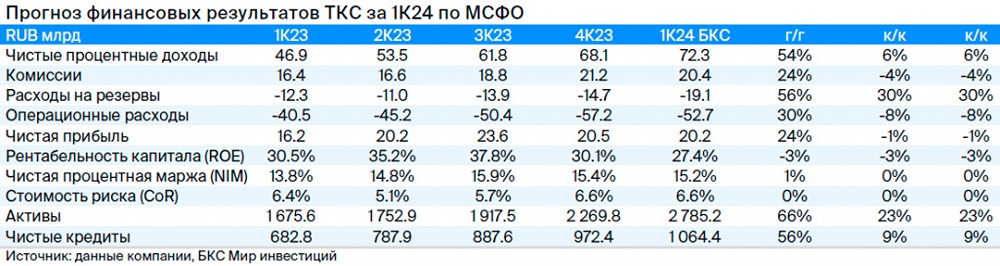 Мнение: БКС Мир Инвестиций. Ожидаем чистую прибыль за I квартал 2024 в размере 20,2 млрд руб. (+24% г/г). ТКС в четверг, 16 мая 2024 г., раскроет отчетность за I квартал 2024 г. по МСФО. • Ждем, что чистый процентный доход увеличился до 72,3 млрд руб. (+6% к/к, +54% г/г). В числе факторов — по-прежнему высокая маржинальность банковского бизнеса и рост процентных ставок. Рост сохранится и в кредитном портфеле, который, вероятно, достиг 1 064 млрд руб. (+9% к/к, +56% г/г). • Комиссионный доход, по нашим ожиданиям, составил 20,4 млрд руб. (-4% к/к, +24% г/г) на фоне дальнейшего роста клиентской активности, но с учетом сезонно более слабого начала года. • По нашим ожиданиям, отчисления в резерв увеличились на фоне роста кредитного портфеля и составили 19 млрд руб. (+30% к/к) с уровнем стоимости риска без изменений — 6,6%. • Мы ожидаем, что операционные расходы снизятся после сезонного роста в IV квартале 2023 г. и составят 52,7 млрд руб. (-8% к/к, +30% г/г). ТКС | Ожидаем чистую прибыль за I квартал 2024 в размере 20,2 млрд руб. (+24% г/г) - БКС Мир инвестиций Таким образом, ожидаем чистую прибыль за I квартал 2024 г. по МСФО в размере 20,2 млрд руб. (+24% г/г, -1% к/к) с ROE 27,4%. Результат обусловлен продолжающимся ростом кредитов и повышением уровня процентных ставок при стабильном качестве активов. У нас «Позитивный» взгляд на бумагу, которая торгуется в P/E на 2024 г в размере 6,1x против среднеисторических 9,3х. [Не является индивидуальной инвестиционной рекомендацией]