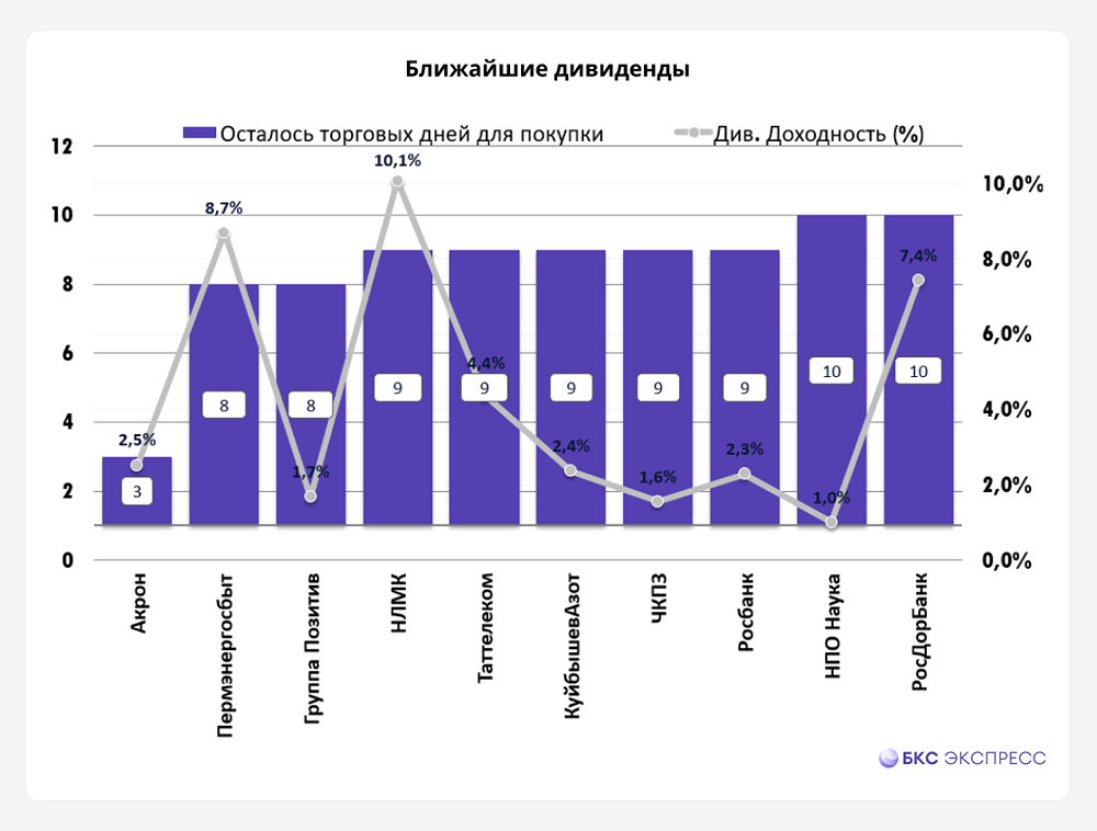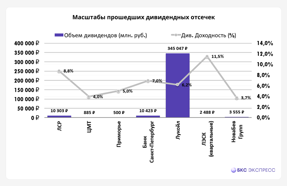Мнение: БКС Мир Инвестиций. Дивидендный сезон 2024. Старт дан. Весенне-летний дивидендный сезон проходит с мая по июль — именно в это время проходят дивидендные отсечки по акциям многих компаний. Размеры дивидендных выплат при этом, как правило, являются самыми высокими, поскольку среди акционеров распределяется прибыль за прошедший календарный год. Есть и малые дивидендные сезоны: в начале октября и в конце декабря – начале января, по итогам которых выплачиваются дивиденды за полгода и девять месяцев соответственно. Однако не все компании выплачивают промежуточные дивиденды. Да и сами выплаты в эти временные промежутки чаще всего скромнее. Для того, чтобы получить дивиденды, необходимо удерживать акции на момент дивидендной отсечки — с учетом режима торгов Т+1 — за один рабочий день до закрытия реестра. Дивидендный сезон 2024 Формальной даты старта дивидендного сезона нет: его можно отсчитывать с начала мая или, например, с первой отсечки крупного эмитента, такого как ЛУКОЙЛ. В текущем сезоне отсечки обозначили уже более 40 эмитентов. Это не финальное число: некоторые компании еще не дали рекомендацию по выплате дивидендов, поэтому список будет дополняться. Со всеми предстоящими закрытиями реестра можно ознакомиться в дивидендном календаре. Масштабы прошедших дивидендных отсечек На диаграмме показаны размеры выплат по бумагам, реестр по которым уже закрыт, а также приведена их дивидендная доходность. Топ-10 акций по дивидендной доходности На диаграмме приведены бумаги с самой высокой дивидендной доходностью в этом сезоне. Ближайшие отсечки На диаграмме показаны ближайшие дивидендные отсечки, а также приведена дивидендная доходность по соответствующим бумагам. Лайфхак. Используя маржинальное кредитование, можно уже сегодня увеличить позиции в акциях, не дожидаясь фактической выплаты дивидендов. Размер рекомендованных дивидендов уже известен, и на эту величину можно купить еще акций, пока рынок не поднялся еще выше. Когда дивиденды поступят, маржинальные позиции за счет них можно будет закрыть. Автор: Олег Решетников. [Не является индивидуальной инвестиционной рекомендацией]