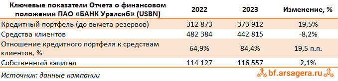 Мнение: УК Арсагера. Итоги 2023 г.: хорошие результаты и первая дивидендная политика. Банк Уралсиб раскрыл консолидированную финансовую отчетность по МСФО за 2023 г. Процентные доходы банка составили 64,8 млрд руб., продемонстрировав увеличение на 26,3% на фоне существенного роста кредитного портфеля, а также увеличения прочих процентных доходов. Процентные расходы возросли на 13,3%, составив 31,4 млрд руб. на фоне увеличения стоимости фондирования. В итоге чистые процентные доходы банка выросли на 41,7%, составив 33,3 млрд руб. Чистые комиссионные доходы сократились на 19,2%, составив 8,8 млрд руб. на фоне снижения доходов от расчетно- кассовых операций. Чистый расход по операциям с ценными бумагами оказался равен 4,3 млрд руб. (+7,3%). В итоге операционные доходы до вычета резервов выросли на 23,6% до 49,9 млрд руб. Снижение оценки уровня дефолтности ряда клиентов способствовали сокращению отчислений на создание резерва под кредитные убытки по долговым финансовым активам до 4,6 млрд руб. (-14,1%). Операционные расходы банка продемонстрировали рост на 11,4% до 31,9 млрд руб., главным образом, из-за увеличения затрат на заработную плату и расходов на обработку данных. В итоге чистая прибыль банка в отчетном периоде составила 8,1 млрд руб., превысив результат предыдущего года на 19,3%. По линии балансовых показателей отметим снижение объема клиентских средств на 8,2% до 442,8 млрд руб. во многом по причине оттока депозитов юридических лиц и достаточно сильного роста кредитного портфеля (+19,5%) до 373,9 млрд руб. как в розничном, так и в корпоративном сегментах. В результате отношение кредитного портфеля к средствам клиентов прибавило 19,5 п.п. и составило 84,4%. Отметим, что в апреле текущего года Уралсиб утвердил первую дивидендную политику, принятую банком в качестве отдельного документа. В соответствии с ней банк будет стремится направлять на дивиденды не менее 50% годовой чистой прибыли. Рекомендации по дивидендным выплатам за 2023 год наблюдательный совет банка пока не дал, но у акционеров теперь есть шанс на получение выплат, которых не было более 10 лет. По итогам внесения фактических данных мы повысили наши ожидания по чистой прибыли банка на текущий и последующие годы, отразив опережающие темпы роста кредитного портфеля по отношению к клиентским средствам, а также учли ожидаемые дивиденды. В результате потенциальная доходность акций банка возросла. Акции Банка Уралсиб торгуются исходя из P/BV 2024 примерно за 0,6 собственного капитала и пока не входят в число наших приоритетов. Автор: Елена Ланцевич. [Не является индивидуальной инвестиционной рекомендацией]