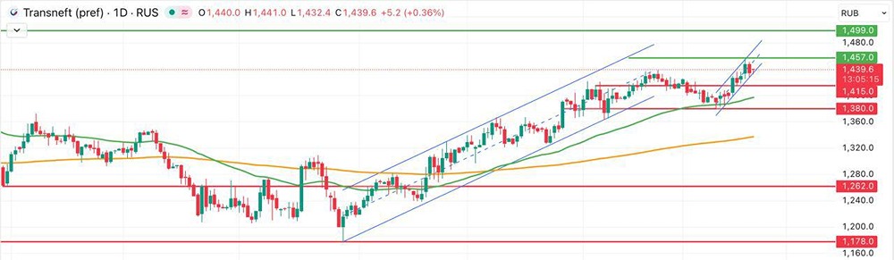 Вчера префы Транснефти снизились на 0,93%. Бумаги просели вместе с рынком, но закрылись заметно слабее индекса, потерявшего 0,3%. Котировки отступили от обновленного днем ранее восьмимесячного максимума. Таким образом, вчерашнее снижение носило коррекционный характер. На дневном графике продолжается развитие восходящего тренда. Закрытие вновь состоялось выше 200-часовой скользящей средней цены, но по итогам дня сложилась умеренно негативная краткосрочная техническая картина. Среднее значение индикатора RSI на часовом графике указывает на то, что бумаги сейчас далеки от состояния перепроданности или перекупленности. Утреннее повышение акций означает приостановку вчерашних распродаж. Сегодня бумаги способны перейти в состояние консолидации в рамках 1415–1457 руб. Вместе с тем сохраняется потенциал для возобновления роста в район 1499 руб. и выше. Не является индивидуальной инвестиционной рекомендацией Пост взят с международного сервиса для инвесторов и трейдеров [M O N D I A R A](https://mondiara.com)