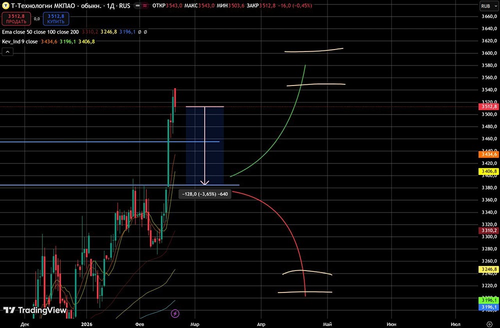 Цена акций вышла к диапазону 3 500–3 545, но они сильно перекуплены по RSI и поднялись выше значения 75. Это дает большую вероятность для отката к зоне поддержки 3 455–3 385, там будет проверяться уровень и перекупленность. И оттуда уже стоит наблюдать за реакцией цены на этот уровень. Ожидаю, что при удержании цены в этом уровне можем поехать выше к 3 550–3 600 пунктам, если же спустимся ниже диапазона поддержки, то, скорее всего, планируется откат к EMA200. Не является индивидуальной инвестиционной рекомендацией Пост взят с международного сервиса для инвесторов и трейдеров [M O N D I A R A](https://mondiara.com) Источник: Биржевой магнат