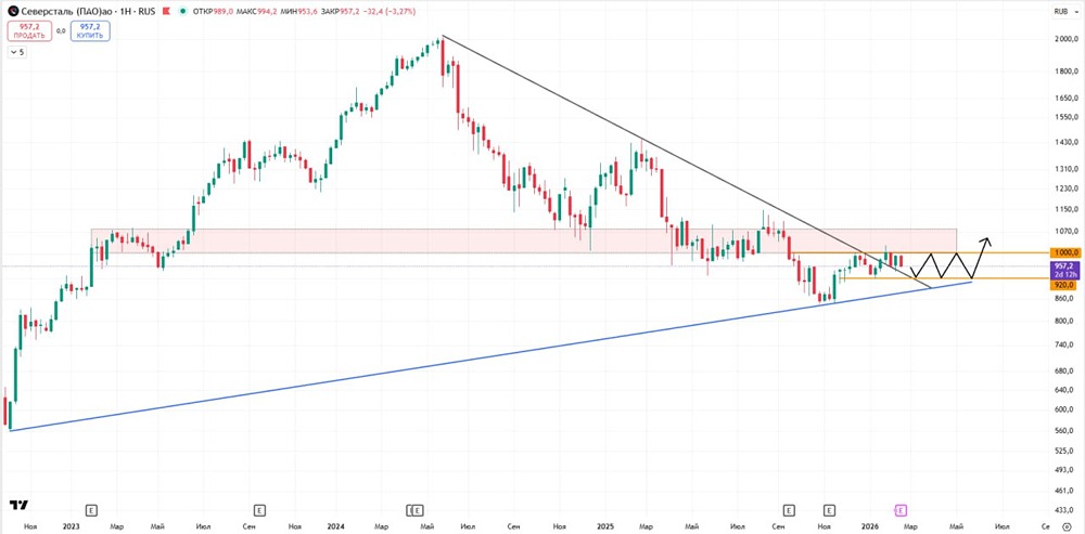 «Северсталь» пробила нисходящую трендовую. Сделала отскок к уровню 1000, но пойти выше пока не получается. Как видим на графике выше, между уровнями 1000 и 1070 расположена зона сопротивления. Пройти её сразу будет тяжело, поэтому ожидаю по активу накопление в районе уровней 920 и 1000, и уже дальше через боковик буду смотреть выход вверх. Также пробой уровня 1000 можно будет рассмотреть как точку входа в лонг с целью верхней границы сопротивления 1070. Не является индивидуальной инвестиционной рекомендацией Пост взят с международного сервиса для инвесторов и трейдеров [M O N D I A R A](https://mondiara.com) Источник: ИНВЕСТИРУЕМ ВМЕСТЕ