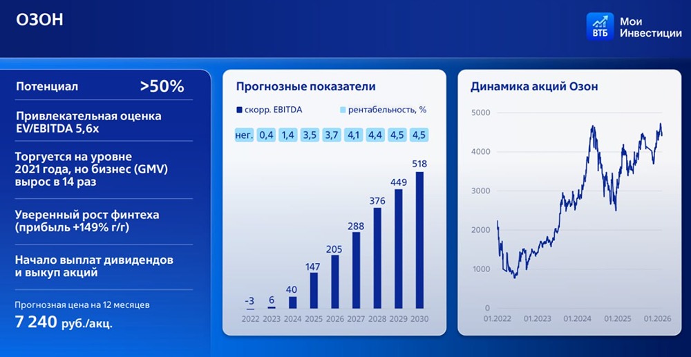 «Озон» — классическая компания роста, которая может еще 5–10 лет не платить дивиденды, но мы видим потенциал роста акций > 50%, — Максим Перлин, управляющий директор ВТБ Мои Инвестиции, на инвестиционном форуме ВТБ «РОССИЯ ЗОВЕТ! Санкт-Петербург». Капитализация компании находится на уровне 2021 года, а бизнес вырос более чем в 10 раз. Не является индивидуальной инвестиционной рекомендацией Пост взят с международного сервиса для инвесторов и трейдеров [M O N D I A R A](https://mondiara.com)
