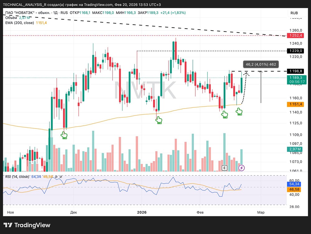 После новости: Близкий к сыну Трампа инвестор заявил о соглашении с «Новатэком» по СПГ и разработке месторождения газа на Аляске — РБК. Актив дал локальный импульс вверх. 📈 Сильная поддержка — EMA200 1151. От неё цена уже неоднократно отскакивала. Это ключевая зона спроса. Локальное сопротивление — 1198–1199. Выше — 1229, далее 1250. Пока цена ниже 1199, структура остаётся боковой. Пробой и закрепление выше прошлого максимума 1199 станет сигналом смены локального тренда на восходящий. RSI 54 — перегрева нет, потенциал движения сохраняется. ⚡️ Пробой 1199 откроет дорогу к 1229, далее 1230–1250. Если импульс окажется ложным и цена уйдёт ниже 1151, давление усилится. ✅ Итог EMA200 остаётся сильной поддержкой. Рост продолжится только после уверенного пробоя 1199. ⚡️ Закрепление выше — цель 1230–1250. Не является индивидуальной инвестиционной рекомендацией Пост взят с международного сервиса для инвесторов и трейдеров [M O N D I A R A](https://mondiara.com) Источник: Инвестиции в будущее