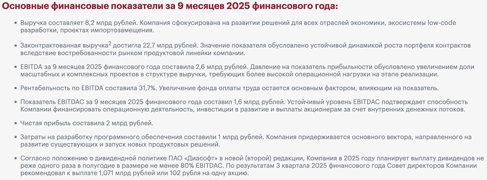 Диасофт на грани кризиса Компания Диасофт опубликовала слабые финансовые результаты за первые девять месяцев 2025 года. Предлагаю обсудить ситуацию, учитывая новые данные. Что произошло? — Отчет. Вместо полноценного финансового отчета, компания ограничилась пресс-релизом. Это вызывает вопросы о прозрачности и открытости компании. — Рынок. Год назад я предсказывал снижение выручки из-за перехода крупных банков на собственное ПО. Но реальность оказалась еще более пессимистичной: 1. Крупные банки уходят от Диасофта. Они разрабатывают собственное ПО, что делает продукт Диасофта ненужным. 2. Мелкие банки сокращают расходы. Из-за роста резервов и замедления экономики, они экономят на ПО. 3. Сектор сокращается. Число банков уменьшается из-за поглощений и ликвидаций, что снижает количество заказчиков для Диасофта. — Гайденс. По итогам финансового года (сдвинут на 1 квартал), менеджмент ожидает роста выручки всего на 5% до 10.5 млрд рублей. Это катастрофический результат для IT-компании. — Дивиденды. Неожиданно было решение распределить дивиденды в 102 рубля из нераспределенной прибыли. Это выглядит как прощальный жест. — Социальные взносы. Отчет не учитывает удвоение социальных взносов для IT-сотрудников с 2026 года. Это основная статья расходов, которая снизит маржу по EBITDA. Вывод: Ситуация для Диасофта крайне тревожная и затратная. Не является индивидуальной инвестиционной рекомендацией Пост взят с международного сервиса для инвесторов и трейдеров [M O N D I A R A](https://mondiara.com) Источник: Invest_Palych