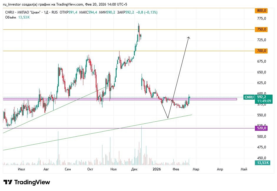Циан после гэпа остыл и показывает очевидный разворот. До трендовой, как мы ждали, не дошёл, сейчас пробил и закрепляется выше сопротивления. Если закрытие сессии будет на том же уровне, в понедельник можно будет встать в лонг на закрытие разрыва. 🏹 Цели: 700 и 750, более среднесрочно — 800. ❌ Звонок 550 сразу под трендовую. Не является индивидуальной инвестиционной рекомендацией Пост взят с международного сервиса для инвесторов и трейдеров [M O N D I A R A](https://mondiara.com) Источник: Хроники Инвестора