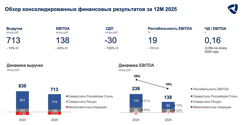 Когда компания открыто говорит о своих проблемах, это вызывает уважение. Но в случае с Северсталью возникает и чувство тревоги за будущее этой инвестиционной идеи. Сегодня мы подведём итоги 2025 года по Северстали, разберём отчёт МСФО и заявления менеджмента. Выручка компании за отчётный период снизилась на 14% до 712,9 млрд рублей. Это произошло из-за падения средних цен на металлопродукцию. Однако операционные результаты выглядят устойчиво. Производство стали выросло на 4%, а чугуна — на 12%. Продажи стальной продукции в натуральном выражении увеличились на 4% до 11,2 млн тонн. Продажи растут вслед за производством. Северсталь находит новые каналы сбыта и отбирает объёмы у конкурентов. По итогам 2025 года компания заняла первое место по поставкам плоского стального проката в России, вытеснив ММК на второе место. Но цены на горячекатаный лист остаются на минимальных уровнях за последние годы — около 44 836 рублей за тонну (CPT ЦФО). Это и приводит к падению выручки. Конъюнктура также не способствует росту. Застройщики столкнулись с серьёзными проблемами, что приведёт к отказу от новых проектов и снижению спроса на строительные материалы. В 2025 году потребление стали снизилось на 12%, а в 2026 году ожидается аналогичный тренд с темпами в 3–4%. Себестоимость продаж за 2025 год снизилась всего на 4,4%, а операционные расходы остались на уровне прошлого года. Из-за этого выручка падает, а затраты снизить не удаётся. В итоге EBITDA компании упала на 42% до 137,6 млрд рублей. А если учесть обесценение основных средств и активов на 33 млрд рублей, то чистая прибыль снизилась на 79% до 32 млрд рублей. Обесценение активов — важный тренд, который может повлиять на другие компании. Северсталь провела оценку будущих денежных потоков своего горнодобывающего дивизиона «Северсталь Ресурс». Из-за высокой ключевой ставки, сложных экономических условий и изменения ставки дисконтирования пришлось списать 33 млрд рублей в убыток. Компания заранее заложила в свои модели возможные трудности. В целом, ситуация не изменилась. Замедление экономики и проблемы в строительной отрасли тормозят продажи. Высокий CAPEX приводит к отрицательному денежному потоку и отказу от дивидендов. Однако пик инвестиционной программы пройден, и нормализация деловой активности может улучшить показатели компании. Этого я и ожидаю. Не является индивидуальной инвестиционной рекомендацией Пост взят с международного сервиса для инвесторов и трейдеров [M O N D I A R A](https://mondiara.com) Источник: ИнвестТема | Литвинов Владимир