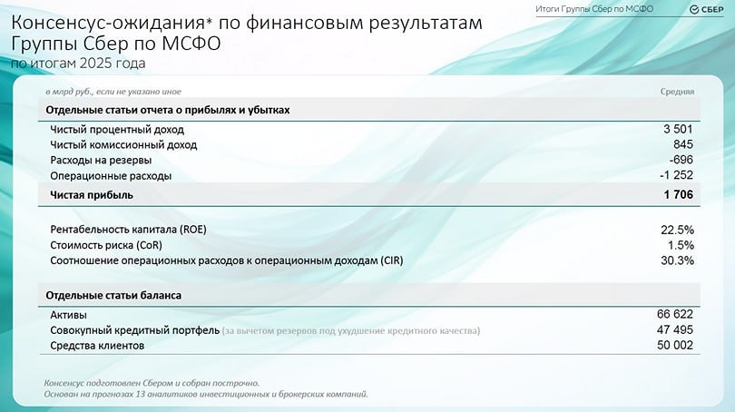 Эксперты предсказали рост прибыли «Сбера» по итогам 2025 года до нового рекорда Аналитики ожидают, что чистая прибыль Сбербанка по итогам 2025 года по МСФО составит, согласно средней оценке, ₽1,706 трлн. Это следует из опроса 13-ти аналитиков инвестиционных и брокерских компаний, который провел банк. Результаты опроса приводятся в рассылке Investor Relations «Сбера», которая есть в распоряжении «РБК Инвестиций». Из прогноза следует, что чистая прибыль Сбербанка может вырасти на 7,95% по сравнению с 2024 годом, когда показатель был на уровне ₽1,58 трлн, тем самым достигнув рекорда в третий раз подряд. За 2024 год Сбербанк выплатил акционерам рекордные дивиденды — ₽34,84 на одну обыкновенную или привилегированную акцию. Предполагается, что за 2025 год выплаты будут еще больше. Аналитики, опрошенные «РБК Инвестициями» в начале января, ожидали, что дивиденды могут составить от ₽40 за акцию до ₽36,9 на акцию. Не является индивидуальной инвестиционной рекомендацией Пост взят с международного сервиса для инвесторов и трейдеров [M O N D I A R A](https://mondiara.com) [Скачать](https://apps.apple.com/ru/app/m-o-n-d-i-a-r-a/id6475953453) приложение в App Store [Скачать](https://play.google.com/store/apps/details?id=com.mondiara.app) приложение в Google Play Источник: www.rbc.ru