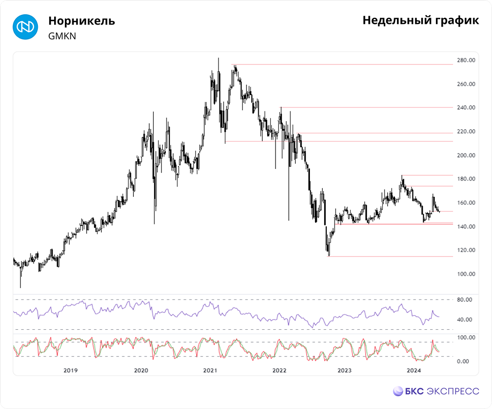 Мнение: БКС Мир Инвестиций. ГМК Норильский никель. Ждем подъем к 153 руб. На предыдущей торговой сессии акции Норникеля выросли на 0,29%, закрытие прошло на отметке 152,48 руб. Бумага выглядела на уровне рынка, прибавившего 0,2%. Краткосрочная картина: - Во вторник акции Норникеля сдержанно подросли отчасти благодаря подъему цен на платину на 3,4%. - На часовике стохастик вошел в зону перекупленности, хотя вчерашний подъем укладывается лишь в рамки отскока после обновления минимумов с апреля 2024 г. Краткосрочно возможен рост к 153 руб. Цены на ключевые металлы Норникеля сегодня с утра подрастают, что должно способствовать росту активности быков. - На дневном интервале стохастик на стороне покупателей, однако падающая тенденция с апрельских вершин остается актуальной. - Фундаментально остаются актуальными риски низких дивидендов или их отсутствия по итогам 2023 г. Решение по размеру выплат должно появиться в ближайшие месяцы. Внешний фон. Азиатские рынки торгуются преимущественно на отрицательной территории. Фьючерс на индекс S&P 500 растет на 0,1%, нефть Brent в плюсе на 0,1% и находится около $82,9. Уровни сопротивления: 153 / 157 / 158 Уровни поддержки: 151 / 150 / 147 Долгосрочная картина: - В 2021 г. стартовала коррекция от исторических вершин, которая переросла в двухлетний падающий тренд. От исторических максимумов к текущему моменту котировки потеряли более 40%. - С конца 2023 г. акции Норникеля находятся в боковике, отражая ухудшение конъюнктуры на рынках ключевых металлов, неопределенность по дивидендам. Нижней границей консолидации выступает уровень 142 руб. - Подъем акций в последние недели укладывается в рамки коррекционного отскока после импульса снижения в феврале. При этом драйверов для начала полноценного растущего тренда пока сложно обозначить. [Не является индивидуальной инвестиционной рекомендацией]