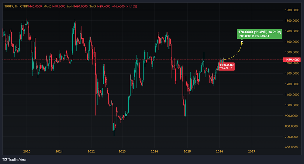 Мнение: РИКОМ-ТРАСТ Акции ПАО «Транснефть»: перспективы и привлекательность Цена покупки: 1430 руб. Цена продажи: 1600 руб. Срок: 5 месяцев Доходность: 12% Годовая доходность: 28% Почему стоит инвестировать? 18 февраля акции «Транснефти» достигли локального максимума, поднявшись до 1457 руб. В тот день они выросли более чем на 1,5%, чему способствовало заявление Еврокомиссии о необходимости восстановить работу нефтепровода «Дружба» на территории Украины и возобновить поставки нефти в Венгрию и Словакию. Технически акции продолжают двигаться в восходящем тренде на дневных и недельных графиках. Вероятность сохранения растущего тренда в ближайшие месяцы остается высокой. По мере приближения даты закрытия реестра акционеров 17 июля спрос на акции компании будет расти. Дивидендная доходность акций за 2024 год превысила 14%, а в 2025 году ожидается на уровне 13–15%. Финансовые показатели за 9 месяцев 2025 года по РСБУ: Выручка: 955,1 млрд руб. (+1,3% г/г) Чистая прибыль: 105,2 млрд руб. (+8,5%) Факторы инвестиционной привлекательности • Несмотря на повышение налога на прибыль с 20 до 40% в 2025–2030 годах, компания сохранила рентабельность. • Тарифы компании, устанавливаемые ФАС России, ежегодно индексируются. С 1 января 2026 года тарифы выросли на 5,1%. • Укрепление рубля и падение цен на нефть в 2025 году не повлияли на финансовые показатели компании. • «Транснефть» увеличила объемы прокачки нефти благодаря повышению квот добычи ОПЕК+. • Отрицательный чистый долг. Соотношение чистого долга к EBITDA составляет -0,4%. • Стабильная дивидендная политика. Дивидендная доходность остается двузначной. • Недооцененность компании по финансовым мультипликаторам. P/E составил 3,4х, EV/EBITDA — 1,94х. В 2025 году акции «Транснефти» опередили индекс МосБиржи на 16%. Не является индивидуальной инвестиционной рекомендацией [mondiara.com](https://mondiara.com) 👆 Больше новостей и анализа Скачать приложение в [App Store](https://apps.apple.com/ru/app/m-o-n-d-i-a-r-a/id6475953453) Скачать приложение в [Google Play](https://play.google.com/store/apps/details?id=com.mondiara.app) Пост взят с международного сервиса для инвесторов и трейдеров [M O N D I A R A](https://i.mondiara.com/) Источник: t.me/ricom_trast