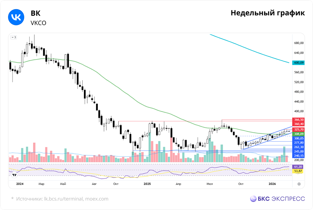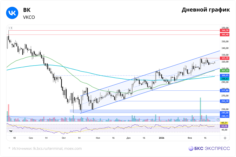 Мнение: БКС Экспресс Прогноз по акциям ВК Акции VK: анализ и прогноз В пятницу акции VK выросли на 0,54%, достигнув 317,6 руб. За выходные и понедельник они прибавили еще 0,08%, поднявшись до 317,9 руб. Торги в пятницу были ниже среднего — 481 млн руб. Утром акции выросли на 0,5% по сравнению с закрытием понедельника. Краткосрочная перспектива • Акции продолжают движение в восходящем канале. В пятницу они торговались преимущественно в плюсе. Индекс МосБиржи вырос на 0,28% за основную сессию и на 0,41% на вечерних торгах. • Прошлую неделю акции завершили в умеренном минусе с длинной верхней тенью. В восходящем канале продолжается тестирование ближайших сопротивлений. Продавцы сдерживали рост на уровне 326 руб. в течение двух недель. • Основной причиной роста в феврале стали новости о возможной блокировке иностранных мессенджеров. Также поддержку оказывает участие компании в государственных проектах. • На дневном графике сформирован бычий сигнал «Золотой крест»: 50-дневная скользящая средняя пересекла 200-дневную снизу вверх. Это усиливает внимание к сопротивлению 326 руб., хотя не гарантирует продолжение роста. • Внешний фон остается неопределенным, несмотря на переговоры США, России и Украины. Новый раунд запланирован на 26 февраля. • Позитивным фактором стало снижение ключевой ставки и мягкий сигнал регулятора по монетарной политике. Задолженность компании делает ее чувствительной к стоимости фондирования. • Если акции сохранят восходящую динамику, в I полугодии возможно тестирование зоны 360–366 руб. Это верхняя граница широкого боковика 230–366 руб., в котором акции торгуются с октября 2024 года. Внешний фон В понедельник S&P 500 упал на 1,04%. Сейчас фьючерс на индекс в плюсе на 0,3%. Азиатские рынки закрыты из-за праздников. Нефть Brent растет на 0,7% до $71,6 за баррель. Уровни: Сопротивления: 326, 330, 340 Поддержки: 310, 298, 278 Долгосрочная перспектива • В августе 2023 года началась коррекция от локального максимума. Падение остановилось к концу 2024 года, а нисходящий тренд был преодолен в июле 2025 года. С конца 2024 года сформировался широкий боковик 230–360 руб., границы которого тестируются. • В начале 2026 года акции закрепились выше 200-дневной скользящей средней и психологического уровня 300 руб. Это указывает на технический потенциал роста до 360–366 руб. • Январская свеча «Доджи» нейтральна на месяц. Февральская свеча может закрыться в плюсе, но верхняя тень говорит о сохранении неопределенности. • Фундаментальная картина неоднозначна. С одной стороны, есть господдержка, активность по IPO и SPO, а также развитие проекта MAX. С другой — осторожная политика ЦБ и риски фискальных мер в IT-секторе ограничивают рост. • Акции VK часто движутся сильнее рынка из-за высокой чувствительности к процентным ставкам и низкой рентабельности. Замедление роста рынка онлайн-рекламы в 2026 году добавляет рисков. • Целевая цена на год — 310 руб. Взгляд на бумагу — «негативный». Автор: Смирнов Андрей Не является индивидуальной инвестиционной рекомендацией [mondiara.com](https://mondiara.com) 👆 Больше новостей и анализа Скачать приложение в [App Store](https://apps.apple.com/ru/app/m-o-n-d-i-a-r-a/id6475953453) Скачать приложение в [Google Play](https://play.google.com/store/apps/details?id=com.mondiara.app) Пост взят с международного сервиса для инвесторов и трейдеров [M O N D I A R A](https://i.mondiara.com/) Источник: bcs-express.ru