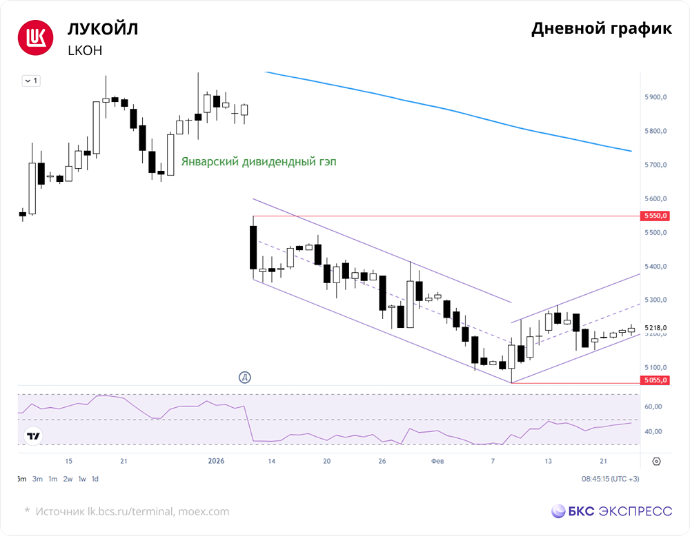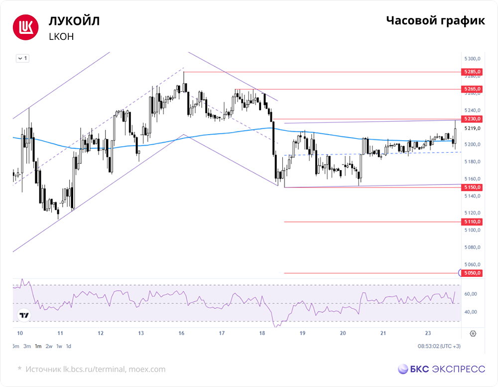 Мнение: БКС Экспресс Прогноз по акциям ЛУКОЙЛа Акции ЛУКОЙЛа вчера подорожали на 0,47% до 5211 руб. По сравнению с пятничным закрытием рост составил 0,67%. Объем торгов достиг 0,4 млрд руб. На утренней сессии рост замедлился до 0,41% или 5207 руб. Краткосрочная перспектива • В выходные акции ЛУКОЙЛа умеренно выросли. Торги были вялыми. Бумага движется в рамках двухнедельного бокового канала. На дневном таймфрейме нет четкого тренда. Это связано с дивидендным гэпом в январе и временной потерей интереса инвесторов. • На закрытии акции оказались выше 200-часовой SMA. Краткосрочно техническая картина выглядит нейтрально. Утреннее значение RSI на часовом графике показывает, что акции не перекуплены и не перепроданы. • Утром акции ЛУКОЙЛа не смогли преодолеть сопротивление на уровне 5230 руб. Вероятно, в течение дня будет попытка подойти к этой отметке и выше. Среднесрочная цель роста — 5285 руб. Внешний фон • Индекс S&P 500 снизился на 1,04%. Фьючерсы на S&P 500 утром растут на 0,3%. Азиатские индексы показывают смешанную динамику. Нефть Brent подорожала на 0,6% до $71,9 за баррель. Уровни сопротивления: 5230/5265/5285 Уровни поддержки: 5150/5110/5050 Долгосрочная перспектива • Акции ЛУКОЙЛа заметно ниже 200-дневной SMA. Быстрого возврата к ней пока не ожидается. Однако после январской дивидендной отсечки наметился конец периода слабости. • В долгосрочной перспективе техническая картина нейтральная. Дальнейшая динамика будет зависеть от внешней политики и санкций против России. • Аналитики БКС прогнозируют цену 6100 руб. через год. Это предполагает рост на 17% от текущих уровней. Автор: Манжос Виталий Не является индивидуальной инвестиционной рекомендацией [mondiara.com](https://mondiara.com) 👆 Больше новостей и анализа Скачать приложение в [App Store](https://apps.apple.com/ru/app/m-o-n-d-i-a-r-a/id6475953453) Скачать приложение в [Google Play](https://play.google.com/store/apps/details?id=com.mondiara.app) Пост взят с международного сервиса для инвесторов и трейдеров [M O N D I A R A](https://i.mondiara.com/) Источник: bcs-express.ru
