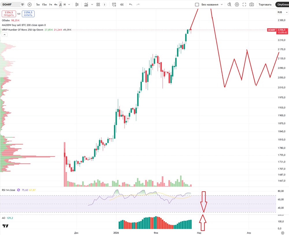 Анализ компании Сектор: Финансовые услуги. Компания уже несколько месяцев торгуется на рынке, и пришло время провести первый полноценный разбор этой крупной организации. Основные метрики - Капитализация: 5,29 млрд долларов. - P/E: 4,58. - P/S: 2,31. - P/B: 0,87. - EPS: 493,04 рубля. Текущая оценка компании уже не является низкой по сравнению с её стартом на бирже. Давайте разберёмся подробнее. Новостной фон - Альфа-банк не исключает краткосрочных коррекций по акциям ДОМ РФ, но советует использовать их для покупки или наращивания позиций. Ранее банк прогнозировал потенциал роста до 2950 рублей. - ДОМ РФ ожидает дивиденды в размере 290 рублей по итогам 2026 года. - Аналитики предсказывают рост акций ДОМ РФ на 20–30%. - ДОМ РФ прогнозирует чистую прибыль по итогам 2026 года в размере 104 млрд рублей (+17% год к году). - По итогам 2025 года ДОМ РФ стал вторым крупнейшим эмитентом корпоративных облигаций: размещено 11 выпусков на 670 млрд рублей. Компания активно привлекает внимание аналитиков и инвесторов благодаря мощному новостному фону. Это редкость для российских компаний, поэтому заслуживает высокой оценки. Финансовое здоровье - Собственный капитал компании за 2025 год вырос на 24%, а в 2024 году — на 16%. - Обязательства компании за 2025 год увеличились на 15%, а в 2024 году — на 38%. - Коэффициент Debt/Equity составляет 12,67. Для сравнения: у Сбера — 7,2, у ВТБ — 12,41, у Т-Технологий — 6,63, у МосБиржи — 47,88, у Совкомбанка — 9,75, у БСП — 5,11. Таким образом, у ДОМ РФ значение этого коэффициента выше, чем в среднем по сектору. Финансовое состояние компании выглядит стабильным. Рост собственного капитала в 2025 году был быстрее, чем в 2024 году. Однако для полной картины необходимо оценить динамику собственного капитала в 2026 году, так как в 2025 году рост мог быть связан с IPO. Высокий уровень обязательств обычно указывает на то, что финансовая компания ожидает увеличения выручки и прибыли. Для финансовых организаций это не является проблемой. Выручка и прибыль - Выручка компании за 2025 год выросла на 36%, а в 2024 году — на 52%. - Прибыль компании за 2025 год увеличилась на 35%, а в 2024 году — на 39%. Будущее и оценки - Прогнозы аналитиков: Альфа-Банк — 2950 рублей, Эйлер — 2900 рублей, Газпромбанк — 2800 рублей, АТОН — 2785 рублей, Т-Инвестиции — 2720 рублей, Синара — 2720 рублей, Сбер CIB — 2650 рублей. Основные акционеры - 89,90% акций принадлежит Российской Федерации. - 10,10% акций находятся в свободном обращении. Сравнение с конкурентами ДОМ РФ входит в пятёрку крупнейших финансовых компаний России по капитализации. По основным метрикам компания оценивается в среднем по сектору, однако, например, Сбер, ВТБ и БСП оцениваются рынком дешевле. По показателю рентабельности (ROE) компания немного уступает среднему уровню по сектору, но заявляет о стремлении достичь 20% по этому параметру. На 2025 год ROE составил 21,6%, но его текущее значение ниже из-за роста акций. Дивиденды На данный момент дивиденды не выплачены. Ожидается, что дивидендная доходность на одну акцию составит 246,9 рубля, выплаты будут произведены в августе 2026 года. Процент доходности будет зависеть от текущей стоимости акций. В настоящее время этот показатель составляет примерно 10,5–11%. Чем выше стоимость акций, тем ниже дивидендная доходность, и наоборот. Технический анализ На данный момент сложно делать выводы на основе технического анализа, так как нет истории торгов. Можно ориентироваться толь