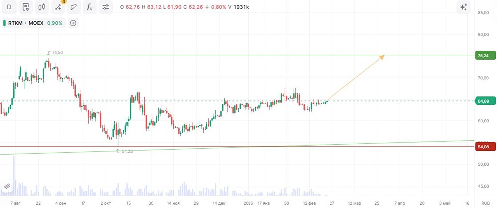 Идея: Long Срок: 3-4 недели Цель: 75,24 руб. Потенциал: 16,21% Объем входа: 8% Стоп-приказ: 54,08 руб. Технический анализ Актив находится в восходящем тренде. При 8% позиции и стоп-заявке на уровне 54,08 риск составит 1,32%, соотношение прибыль/риск — 0,98. Фундаментальный анализ #Ростелеком — крупнейший российский провайдер цифровых решений, предоставляющий связь, облачные платформы и IT-услуги для частных и корпоративных клиентов. Выручка выросла на 10% за 9 месяцев, операционная прибыль — на 15%. Это связано с развитием мобильного бизнеса, цифровых сервисов и облачных платформ. Несмотря на высокую ключевую ставку и рост чистого долга, компания активно инвестирует в технологии, успешно сотрудничает с госсектором и придерживается дивидендной политики. Это создает условия для роста фундаментальной стоимости. Не является индивидуальной инвестиционной рекомендацией Пост взят с международного сервиса для инвесторов и трейдеров [M O N D I A R A](https://mondiara.com) [Скачать](https://apps.apple.com/ru/app/m-o-n-d-i-a-r-a/id6475953453) приложение в App Store [Скачать](https://play.google.com/store/apps/details?id=com.mondiara.app) приложение в Google Play Источник: Точка Входа | Инвестиции