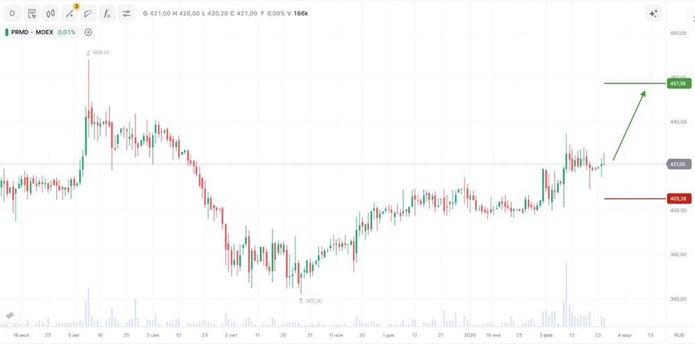Мнение: Финам ПАО «Промомед» Тикер: PRMD Идея: Long Срок: 1 месяц Цель: 456,35 руб. Потенциал: 8,14% Вход: 6% Стоп: 405,15 руб. Технический анализ Акции компании находятся в сужающемся диапазоне, приближаясь к ключевому уровню сопротивления. Это говорит о том, что покупатели активно накапливают позиции. Если цена закрепится выше уровня поддержки и продолжит формировать повышающиеся минимумы, восходящий тренд останется в силе. При входе в позицию объемом 6% и стоп-лоссе на уровне 405,15 руб., риск для портфеля составит 0,24%. Отношение прибыли к риску — 2,04. Фундаментальный анализ Промомед — российская биофармацевтическая компания полного цикла, которая разрабатывает и производит инновационные препараты в эндокринологии и онкологии. Продажи компании растут значительно быстрее рынка благодаря успешному выводу новых препаратов и расширению географии экспорта. Высокая доля инновационной продукции и активные разработки поддерживают оптимистичные прогнозы для дальнейшего роста бизнеса. Не является индивидуальной инвестиционной рекомендацией [mondiara.com](https://mondiara.com) 👆 Больше новостей и анализа Скачать приложение в [App Store](https://apps.apple.com/ru/app/m-o-n-d-i-a-r-a/id6475953453) Скачать приложение в [Google Play](https://play.google.com/store/apps/details?id=com.mondiara.app) Пост взят с международного сервиса для инвесторов и трейдеров [M O N D I A R A](https://i.mondiara.com/) Источник: t.me/finamalert