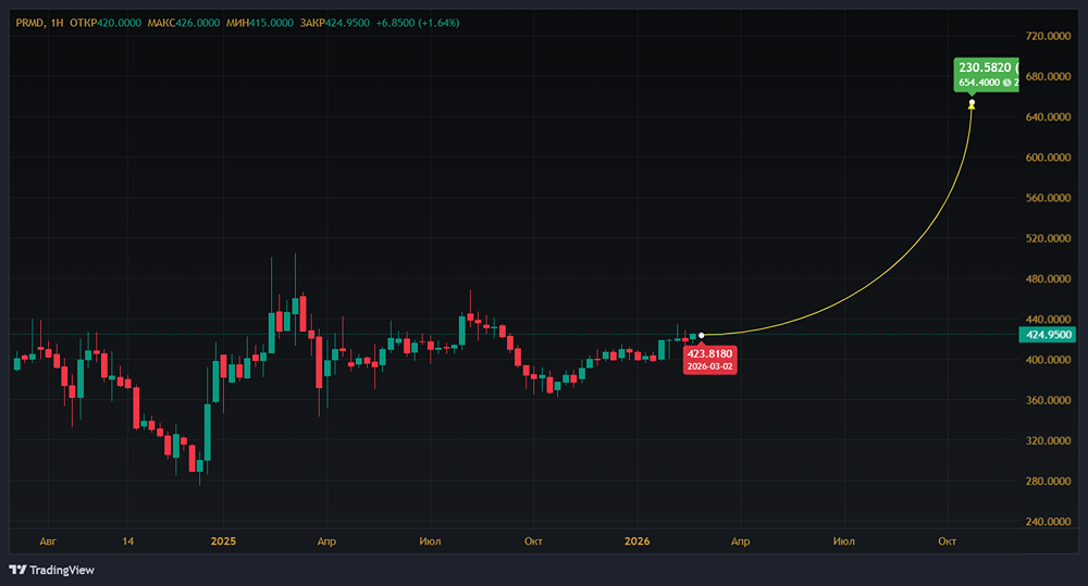 Мнение: Цифра Брокер Промомед: план по выручке выполнен Фармацевтическая компания опубликовала операционные результаты за 2025 год: • Выручка увеличилась на 75,2% по сравнению с прошлым годом и достигла 38 млрд рублей. Это в шесть раз превышает темпы роста фармацевтического рынка. • Эндокринологические и онкологические препараты составили 76% выручки (+15 п.п.). • В эндокринологии выручка выросла на 163% до 21,6 млрд рублей. В онкологии — на 43% до 7 млрд рублей. Прочие препараты показали рост на 8% до 9 млрд рублей. • Портфель компании вырос до 364 препаратов, что на 21 больше, чем в прошлом году. • Бюджетные продажи составили 34%, коммерческие — 66%. Результаты впечатляют. Выручка не только достигла плана, но и значительно превысила динамику рынка, что указывает на расширение доли и высокую эффективность ключевых направлений. Рост качественный. Однако делать окончательные выводы рано. Важно дождаться отчетности по МСФО, чтобы оценить свободный денежный поток. Вероятнее всего, FCF останется отрицательным из-за продолжающихся инвестиций. Это не говорит об ухудшении бизнеса, а отражает текущую инвестиционную фазу. На данный момент операционные результаты выглядят уверенно. Рекомендация по акциям «Промомеда»: покупать. Целевая цена — 654,4 рубля. Не является индивидуальной инвестиционной рекомендацией [mondiara.com](https://mondiara.com) 👆 Больше новостей и анализа Скачать приложение в [App Store](https://apps.apple.com/ru/app/m-o-n-d-i-a-r-a/id6475953453) Скачать приложение в [Google Play](https://play.google.com/store/apps/details?id=com.mondiara.app) Пост взят с международного сервиса для инвесторов и трейдеров [M O N D I A R A](https://i.mondiara.com/) Источник: t.me/vse_v_cifre