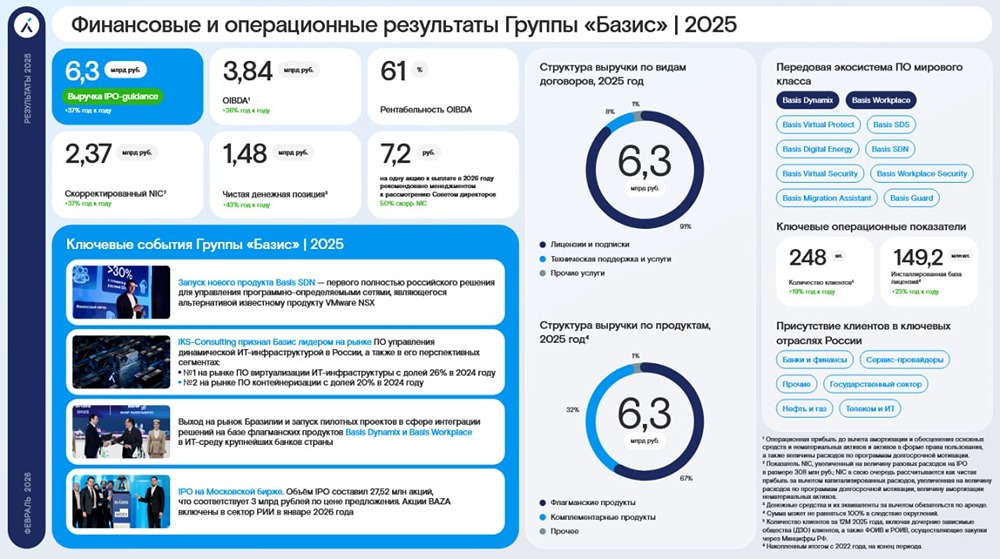 Группа компаний «Базис» отчиталась по МСФО за 2025 год. Результаты превзошли ожидания, особенно в четвертом квартале, который стал рекордным. Ключевые показатели: - Выручка: 6,3 млрд руб. (+37% год к году) - OIBDA: 3,84 млрд руб. (+36% год к году) - Чистая прибыль: 2,22 млрд руб. (+8,6% год к году) - Рентабельность по OIBDA: 61% (-1 п. п. год к году) - Чистая рентабельность: 35% (-9 п. п. год к году) Что важно: - 91,4% выручки приходится на лицензии и подписки. - Флагманские продукты растут на 22%, но основной рост обеспечивают комплементарные решения (+83,6%). - Доля рекуррентной выручки — 38%, что вызывает вопросы о поддержании темпов роста. - Рентабельность по OIBDAC и NIC выросла, несмотря на снижение в годовом сопоставлении. - Финансовые показатели стабильны: отрицательный долг, высокая ликвидность, свободный денежный поток — 2,1 млрд руб. (+143% год к году). - Менеджмент планирует выплатить 50% от скорректированного NIC в 2026 году — около 7,2 руб. на акцию. Операционные результаты: - Инсталлированная база лицензий: 149,2 млн (+23%) - Число клиентов: 248 (+19%) - Штат: 500 сотрудников (+37%), доля ИТ-специалистов — 86%. Планы на 2026 год: - Ожидается рост выручки на 30–40% за счет масштабирования флагманских решений, развития подписочной модели и роста спроса на импортонезависимое ПО. - Рентабельность OIBDA планируется на уровне около 60%, что амбициозно. Вывод: Отчет ГК «Базис» демонстрирует уверенный рост и сильный баланс. Однако есть вопросы по устойчивости темпов роста после завершения крупного проекта. С учетом отчетности, целевая цена акций компании увеличилась до 190 руб. на горизонте года. Не является индивидуальной инвестиционной рекомендацией Пост взят с международного сервиса для инвесторов и трейдеров [M O N D I A R A](https://mondiara.com) [Скачать](https://apps.apple.com/ru/app/m-o-n-d-i-a-r-a/id6475953453) приложение в App Store [Скачать](https://play.google.com/store/apps/details?id=com.mondiara.app) приложение в Google Play Источник: [Investillion - про инвестиции](https://t.me/Investillion)