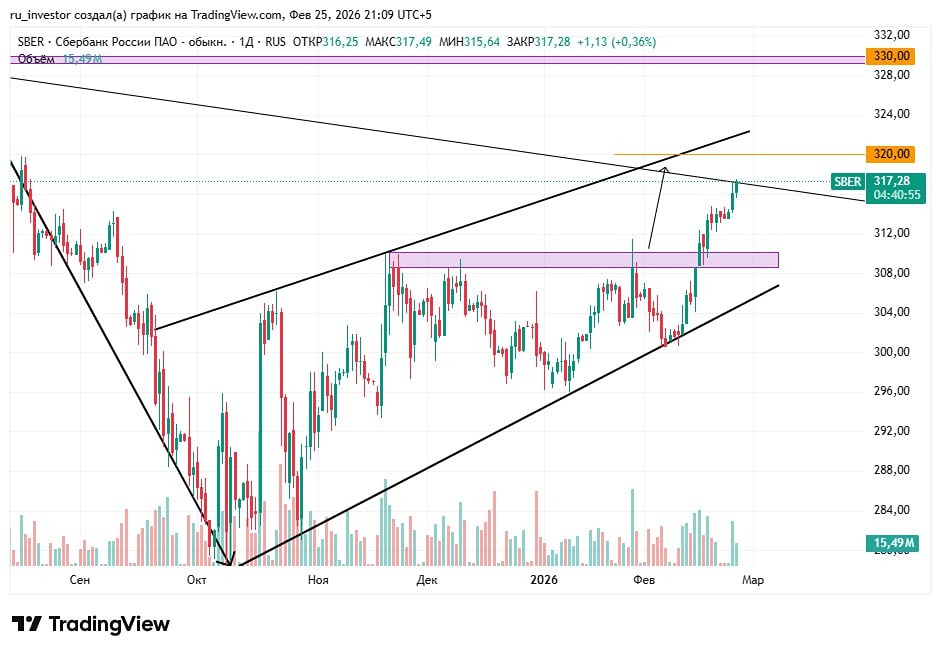 Накануне уверенно шёл наверх с попыткой пробить нисходящую. Давайте последим за вероятным успехом. ➥ Если закрепляется выше 317, тогда можно ждать на 320 и 330. ➥ Либо добор на откате до 309. И оттуда вверх. Не является индивидуальной инвестиционной рекомендацией Пост взят с международного финтех-медиа ресурса [M O N D I A R A](https://mondiara.com) [Скачать](https://apps.apple.com/ru/app/m-o-n-d-i-a-r-a/id6475953453) приложение в App Store [Скачать](https://play.google.com/store/apps/details?id=com.mondiara.app) приложение в Google Play