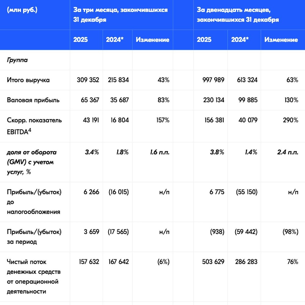 Прибыль вместо убытка. Дело пошло! Компания опубликовала результаты за Q4 и 2025 год. Цифры: • Выручка: +63% г/г до 998 млрд ₽ • EBITDA: +290% г/г до 156 млрд ₽ • Чистая прибыль в Q4: +3,7 млрд ₽ (был убыток 17,6 млрд) Что двигает рост: • GMV +45% до 4,16 трлн ₽ • Активных покупателей >65 млн (+15%) • Финтех: выручка +120%, EBITDA +101% Бонусы акционерам: • Первые дивиденды: 143,55 ₽/акцию • Buyback до 25 млрд ₽ • Долг снижен на 62 млрд ₽ Прогноз на 2026: • GMV +25–30% • EBITDA ~200 млрд ₽ • Чистая прибыль — положительная Ozon уже нормально налил нам прибыли во все портфели. Но сейчас акции на максимумах. Стоит ли их покупать? Полагаю, что для новых покупок нужны более интересные цены. А вот держать имеющуюся прибыль стоит. Займемся сегодня перспективной оценкой акций. Если будет хороший потенциал, подскажу. Не является индивидуальной инвестиционной рекомендацией Пост взят с международного финтех-медиа ресурса [M O N D I A R A](https://mondiara.com) [Скачать](https://apps.apple.com/ru/app/m-o-n-d-i-a-r-a/id6475953453) приложение в App Store [Скачать](https://play.google.com/store/apps/details?id=com.mondiara.app) приложение в Google Play Источник: Юрий Марченко