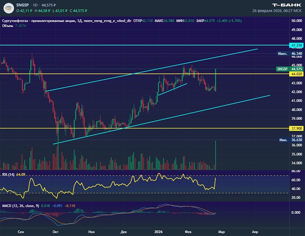 И на рубле же вчера активизировались покупки в «Сургутнефтегазе». Привилегированные акции рывком пробиваются выше 44. При этом откат от этого уровня получился небольшим, а в качестве поддержки теперь можно обозначить уровень 42. Мне вот только не нравится, что эти вчерашние покупки поддерживались роботами (т. е. спрос частью был искусственным), а также формат, в который преобразуется постепенно график Сургута: очень похоже на восходящий канал, который более глобально выглядит медвежьим флагом. В любом случае сейчас, думаю, повезут дальше к верхней границе канала, а там уже посмотрим, что будет дальше. Не является индивидуальной инвестиционной рекомендацией Пост взят с международного финтех-медиа ресурса [M O N D I A R A](https://mondiara.com) [Скачать](https://apps.apple.com/ru/app/m-o-n-d-i-a-r-a/id6475953453) приложение в App Store [Скачать](https://play.google.com/store/apps/details?id=com.mondiara.app) приложение в Google Play Источник: Мысли Финансиста