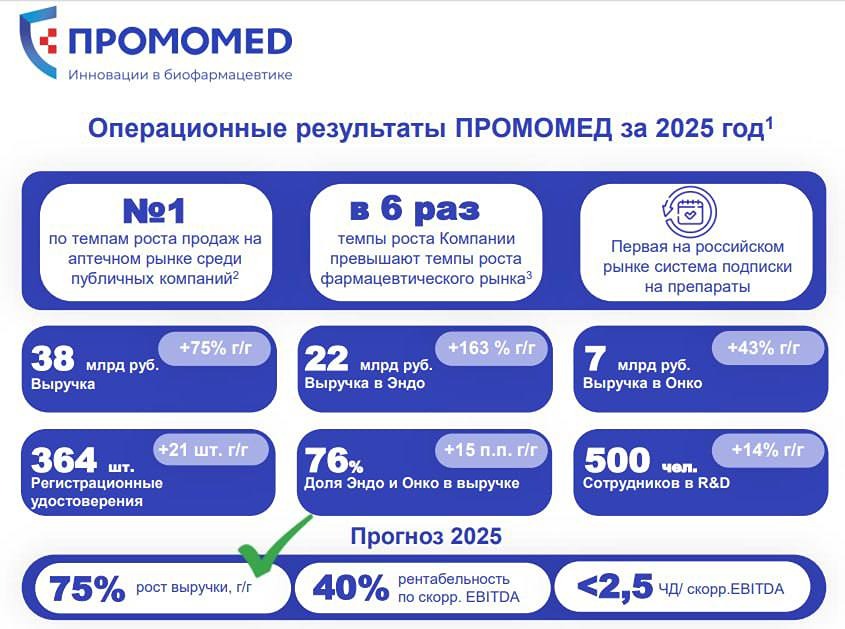 Вышел финансовый отчёт за 2025 год одной из ведущих фармацевтических компаний на российском рынке — Промомед. Ранее я уже отмечал их успешные результаты и прогнозы. Теперь посмотрим, как компания завершила год. Выручка за год выросла на 75,2% и достигла 38 млрд рублей. Основной прирост обеспечил сегмент эндокринологии, который увеличился с 8,2 до 21,6 млрд рублей (+163%). Главным фактором стал выход препарата Тирзетта для лечения ожирения и диабета. Этот препарат стал вторым по абсолютному росту продаж на российском рынке. Также стоит отметить Велгию, разработанный специально для терапии ожирения. За 2025 год она вошла в топ-3 по темпам роста среди всех лекарств розничного сегмента. В конце 2025 года на рынок вышел Ребелсас, который с января 2026 года стал важным драйвером роста продаж. Сегмент препаратов от онкологии показал рост на 42% и достиг 7 млрд рублей. Ключевым фактором стал Прадетро, используемый в терапии рака предстательной железы. Его стоимость на 40% ниже импортных аналогов. На следующий год компания планирует рост выручки на 60–65%, рентабельность по EBITDA на уровне 45–50% и чистую прибыль более 25%. Это амбициозные цели, но компания имеет все шансы их достичь. Отчёт компании впечатляет. Она успешно выполнила прогнозы. Оценка по мультипликаторам высока, но если темпы роста сохранятся и на фондовом рынке вернётся оптимизм, то акции компании могут переоценены. Это делает её привлекательной для среднесрочных инвесторов, желающих добавить в свой портфель небольшую, но стабильную позицию. Не является индивидуальной инвестиционной рекомендацией Пост взят с международного финтех-медиа ресурса [M O N D I A R A](https://mondiara.com) [Скачать](https://apps.apple.com/ru/app/m-o-n-d-i-a-r-a/id6475953453) приложение в App Store [Скачать](https://play.google.com/store/apps/details?id=com.mondiara.app) приложение в Google Play Источник: Уютный разбирает