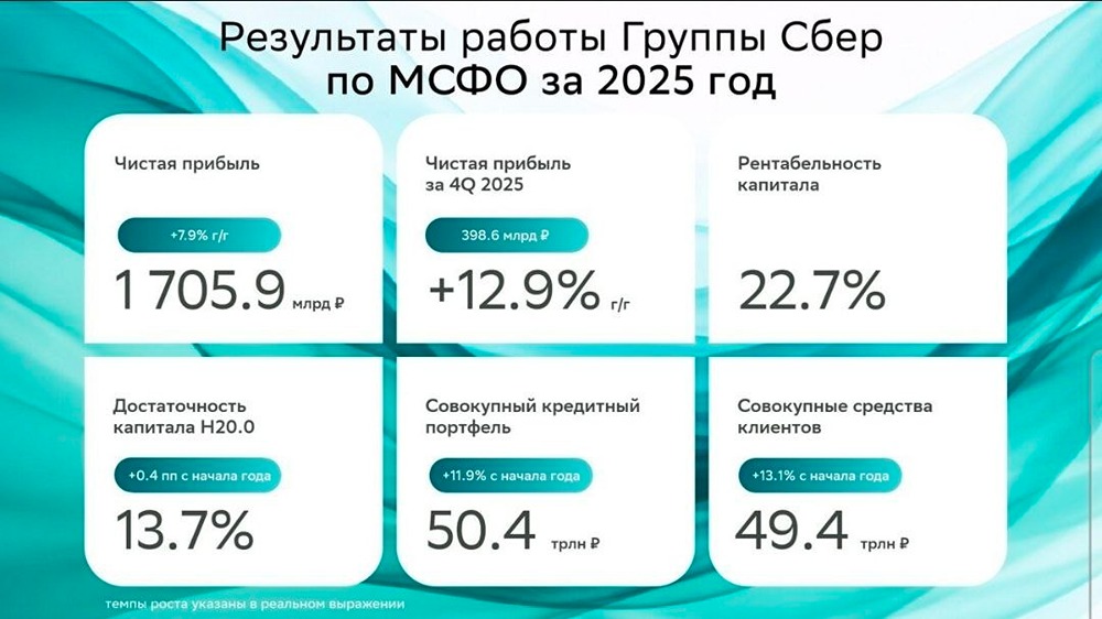 Сбер приближается к прибыли в 2 трлн рублей Крупнейший банк страны представил результаты за 2025 год по международным стандартам финансовой отчетности (МСФО). Чистая прибыль снова установила рекорд: • Чистая прибыль увеличилась на 7,9% и достигла 1705,9 млрд рублей. • Стоимость риска снизилась до 1,3%, что на 0,3 п.п. меньше, чем в прошлом году. • Прибыль на акцию составила 77,8 рублей, что на 8% больше, чем в предыдущем году. • Достаточность капитала Н20.0 увеличилась до 13,7%, что на 0,4 п.п. выше, чем годом ранее. • Соотношение расходов к доходам осталось на уровне 30,3%, как и в 2024 году. • Рентабельность капитала составила 22,7%, что на 1,3 п.п. меньше, чем годом ранее. Герман Греф заявил, что удалось удержать коэффициент издержек к доходам (CIR) благодаря внедрению искусственного интеллекта. По его словам, ИИ стал ключевым фактором роста. ➥ Количество розничных клиентов увеличилось до 110,7 млн человек, что на 0,8 млн больше, чем в начале года. Число активных корпоративных клиентов выросло более чем на 6,2% и достигло 3,5 млн компаний. ➥ Общий кредитный портфель увеличился на 11,9% и составил 50,4 трлн рублей. ➥ Средства корпоративных клиентов снизились на 5,3%, в то время как средства физических лиц выросли на 20,3%. В Сбере хранится 33,4 трлн рублей средств граждан. ➥ Доля обесцененных кредитов составила 4,9%, что на 0,1 п.п. больше, чем в 2024 году. ➥ Прибыль на обыкновенную акцию за 12 месяцев 2025 года выросла до 77,8 рублей и увеличилась на 8% по сравнению с предыдущим годом. За четвертый квартал 2025 года этот показатель вырос на 13,1% до 18,2 рублей. ⚡️ Мнение NZT: Удерживать треть активов банковской системы страны и при этом демонстрировать такие результаты — это значительный успех. Судя по итогам января, Сбер не собирается останавливаться на достигнутом: очередной рекорд в первом месяце года. Такими темпами банк может заработать не меньше чистой прибыли в 2026 году, чем в прошлом, учитывая смягчение денежно-кредитной политики. Дивиденды за 2025 год, скорее всего, будут выплачены. Достаточность капитала позволяет это сделать. Размер выплаты может составить 37,6 рублей на акцию, что обеспечит дивидендную доходность в 11,8%. Не является индивидуальной инвестиционной рекомендацией Пост взят с международного финтех-медиа ресурса [M O N D I A R A](https://mondiara.com) [Скачать](https://apps.apple.com/ru/app/m-o-n-d-i-a-r-a/id6475953453) приложение в App Store [Скачать](https://play.google.com/store/apps/details?id=com.mondiara.app) приложение в Google Play Источник: Igor_Shimko