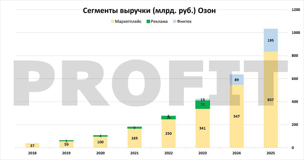 Озон выполнил все прогнозы для инвесторов Ozon опубликовал отчёт по МСФО за 2025 год. Вот ключевые цифры и моё мнение: Выручка: - Общая выручка группы составила почти 1 трлн рублей, что на 63% больше, чем в предыдущем году. EBITDA: - Скорректированная EBITDA достигла рекордных 156,4 млрд рублей, увеличившись на 290% по сравнению с прошлым годом. Сегменты: - Оба направления — e-commerce и финтех — работают в плюс: e-com принёс 91,1 млрд рублей, а финтех — 65,3 млрд рублей. Рентабельность: - Рентабельность по EBITDA улучшилась: доля от оборота составила 3,8%, что на 2,4 п.п. больше, чем в прошлом году. Чистый убыток: - Чистый убыток сократился с 60 млрд рублей до 0,9 млрд рублей. Долги: - Долговая нагрузка снизилась с 118 млрд рублей до 81 млрд рублей. Маркетплейс: 1. Количество активных клиентов достигло 65,1 млн, что на 8,6 млн больше, чем в прошлом году. 2. В среднем каждый клиент делает 38 заказов в год, что на 12 больше по сравнению с прошлым периодом. 3. За год было доставлено 2,5 млрд заказов, что на 69% больше, чем годом ранее. Оборот (GMV) составил 4,2 трлн рублей, увеличившись на 45%. 4. Складские площади выросли до почти 5 млн кв. м (в 1,4 раза), а количество пунктов выдачи заказов (ПВЗ) достигло 83 тыс. (также в 1,4 раза). Финтех: 1. Клиентов стало 41,7 млн, что на 40% больше, чем в прошлом году. 2. Выручка составила 195,2 млрд рублей, что на 120% больше, чем годом ранее; прибыль до налогов — 60 млрд рублей, что почти равно доходам Т-Банка в 2024 году. 3. Доля внешних платежей по картам Ozon превышает 60%, что говорит о их популярности для повседневных трат и обещает хорошие перспективы для банка независимо от маркетплейса. 4. Клиентские средства на счетах и вкладах на конец года достигли 505,8 млрд рублей, увеличившись в 2,6 раза. 5. Активы, приносящие процентный доход, выросли более чем в два раза и составили 677,3 млрд рублей. В 2023–2024 годах часто говорили, что для Ozon сейчас выгодно быть убыточным, чтобы захватить рынок и потом получать высокую прибыль. Этот момент настал. Я считаю, что в будущем прибыль Ozon будет расти, а темпы роста замедляться (по прогнозам менеджмента, в 2026 году оборот вырастет на 30%, что также высоко по сравнению с традиционным ритейлом). Дивиденды уже есть, и в 2026 году они будут на сопоставимом уровне. Не является индивидуальной инвестиционной рекомендацией Пост взят с международного финтех-медиа ресурса [M O N D I A R A](https://mondiara.com) [Скачать](https://apps.apple.com/ru/app/m-o-n-d-i-a-r-a/id6475953453) приложение в App Store [Скачать](https://play.google.com/store/apps/details?id=com.mondiara.app) приложение в Google Play Источник: PROFIT